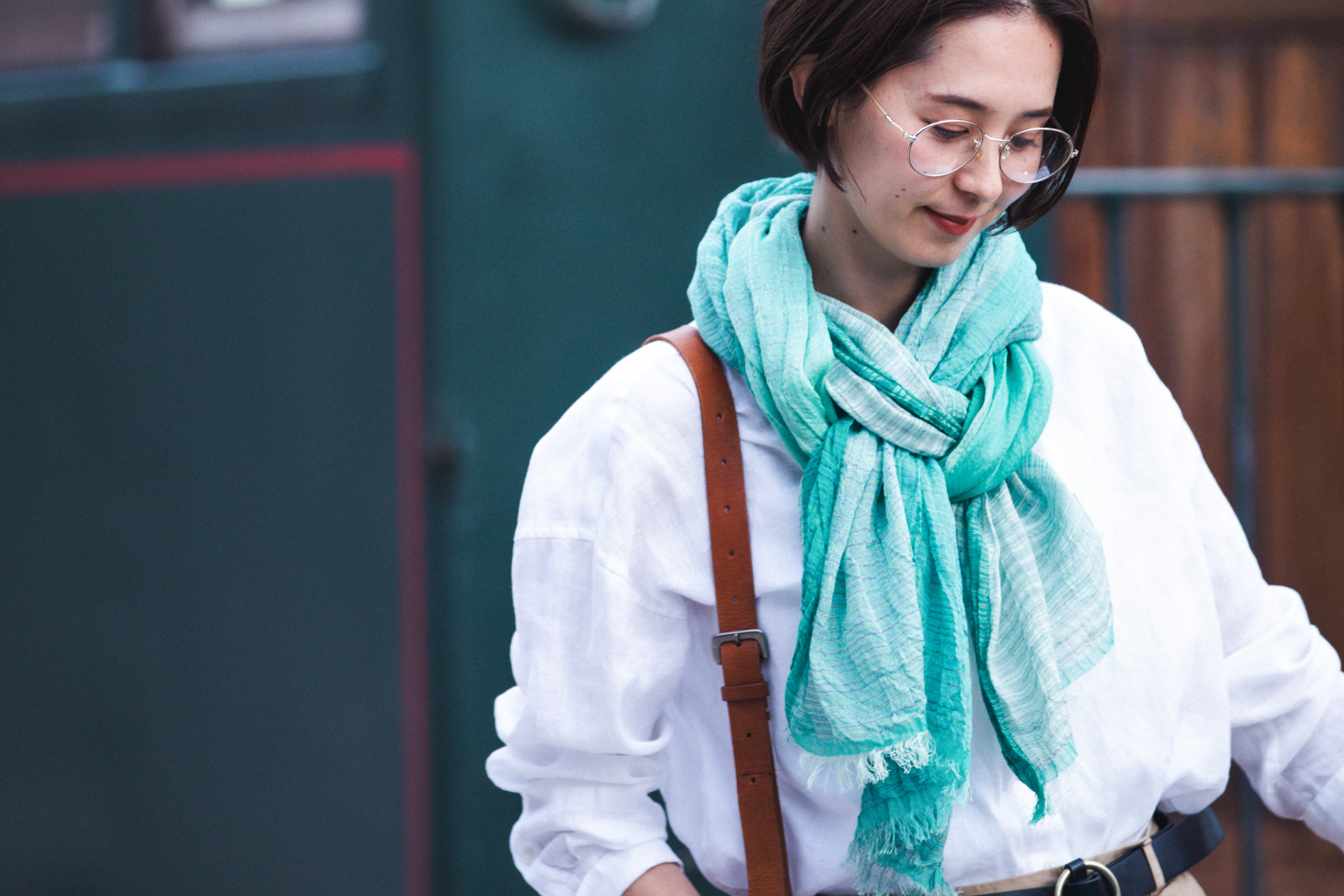 絣染めシルクコットンショール グリーン 着用画像