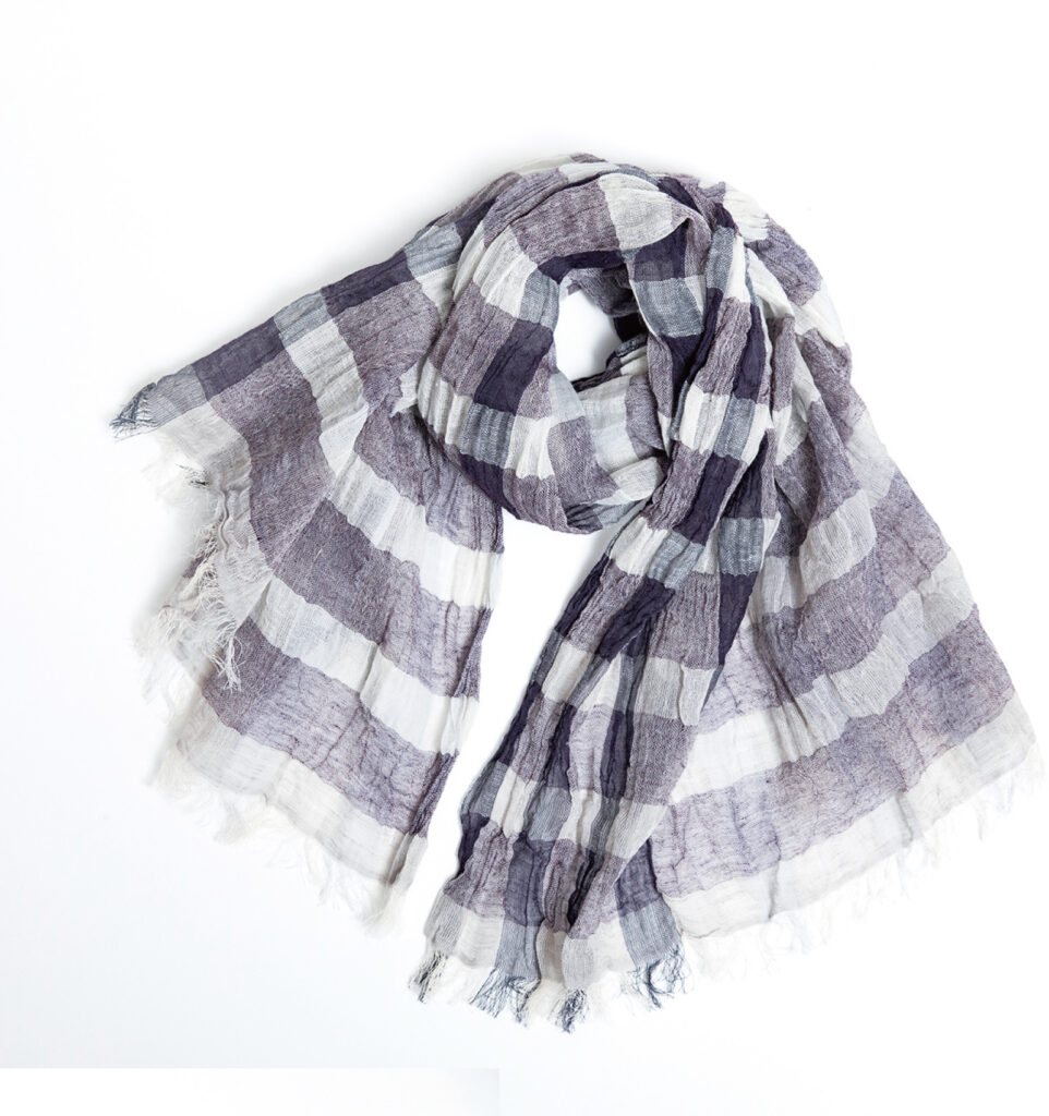 日常的にマスクをすることが普及した今、私たちが作りたいと思ったのが、顔まわりのバランスがとりやすいボリュームを抑えたショール。そこで、春夏に特に人気の「SHIBO リネンコットンチェックショール」から長さだけ55cm短くしたショート丈バージョンを作りました。