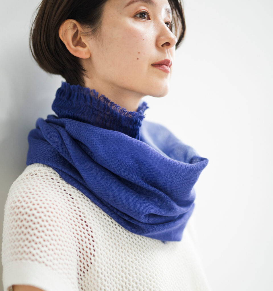 なめらかな肌触りで、巻いた瞬間に「気持ちいい」と感じられるやさしい仕立て。約40cm幅の小さなシャトル織機で、ゆったりと空気を含ませながら織られており、全体的にやわらかく包み込むような質感に仕上がっています。