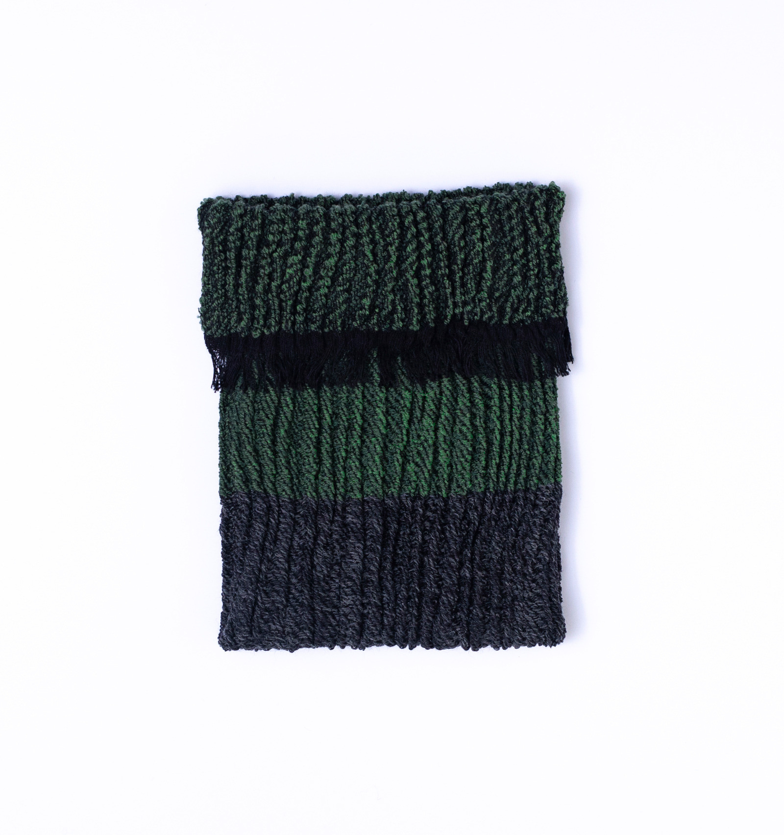 綿55%・ウール45%を綾織りで仕立てた、筒状の無縫製織物。片側で色が切り替わるため、折り返してリバーシブルに使えます。