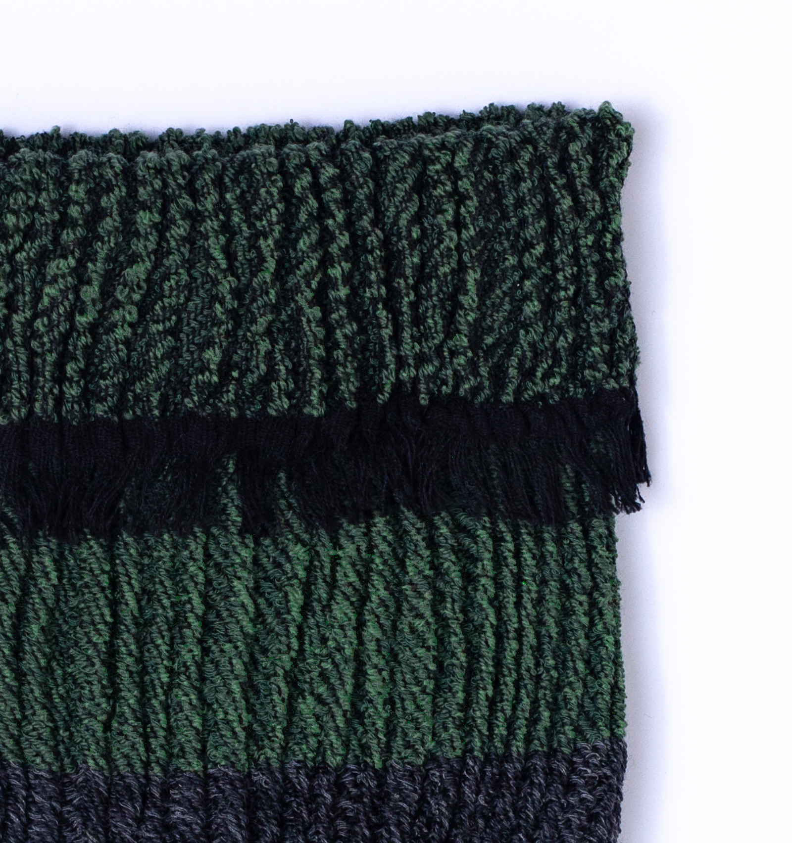 両端は切りっぱなしながらも糸がほつれにくい仕組みを取り入れ、縫製を施さない独自の仕立てに。