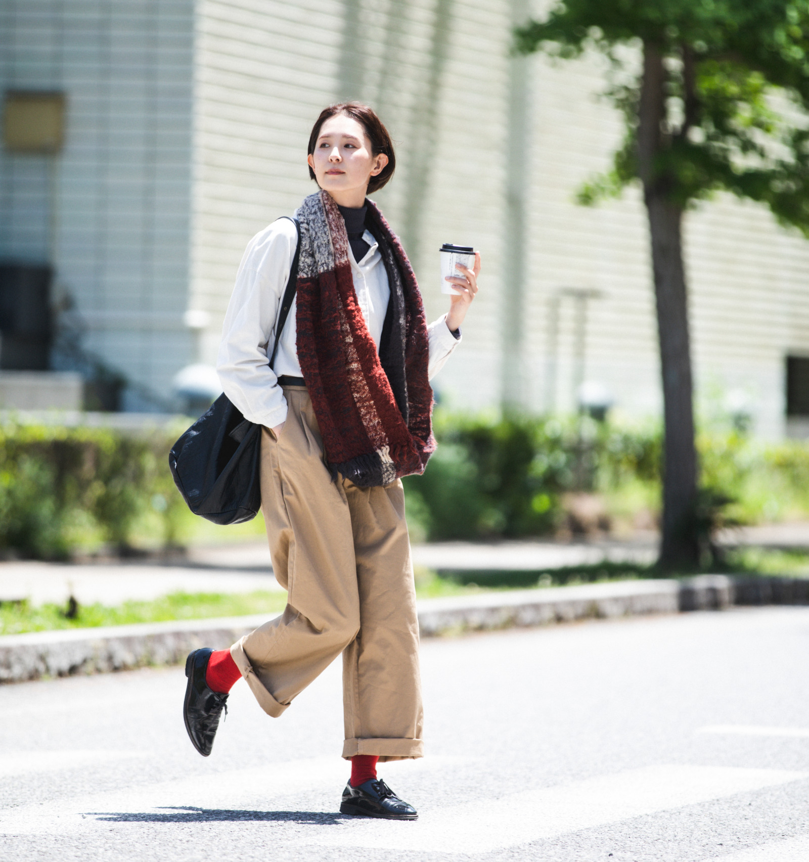 シンプルな装いのなかでも、ひと巻きで印象的に映えるバランスです。
