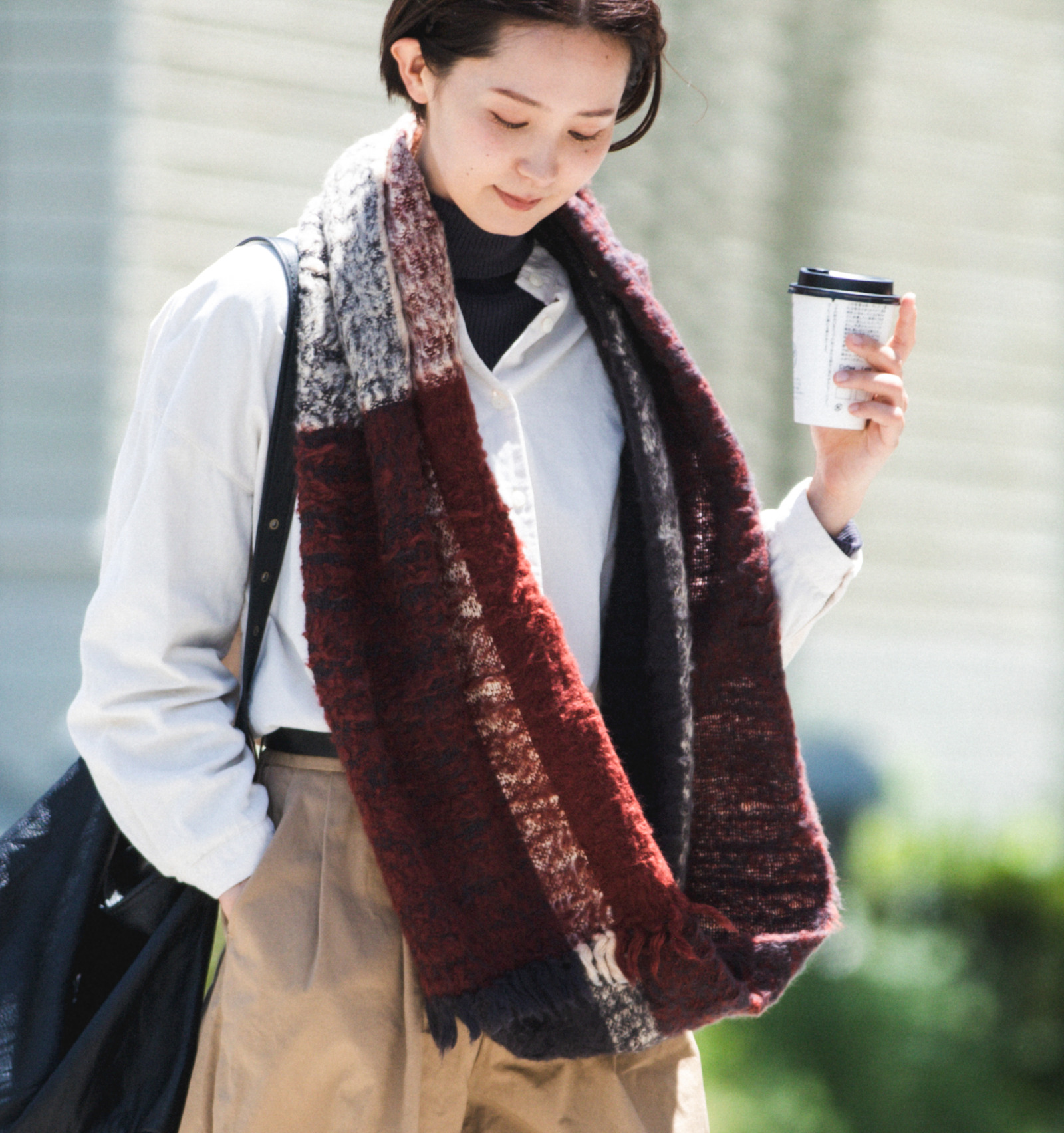 大きく巻いても、コンパクトにまとめても、ふんわりと形が決まり、日常づかいからお出かけまで、軽やかに馴染む心地よさです。