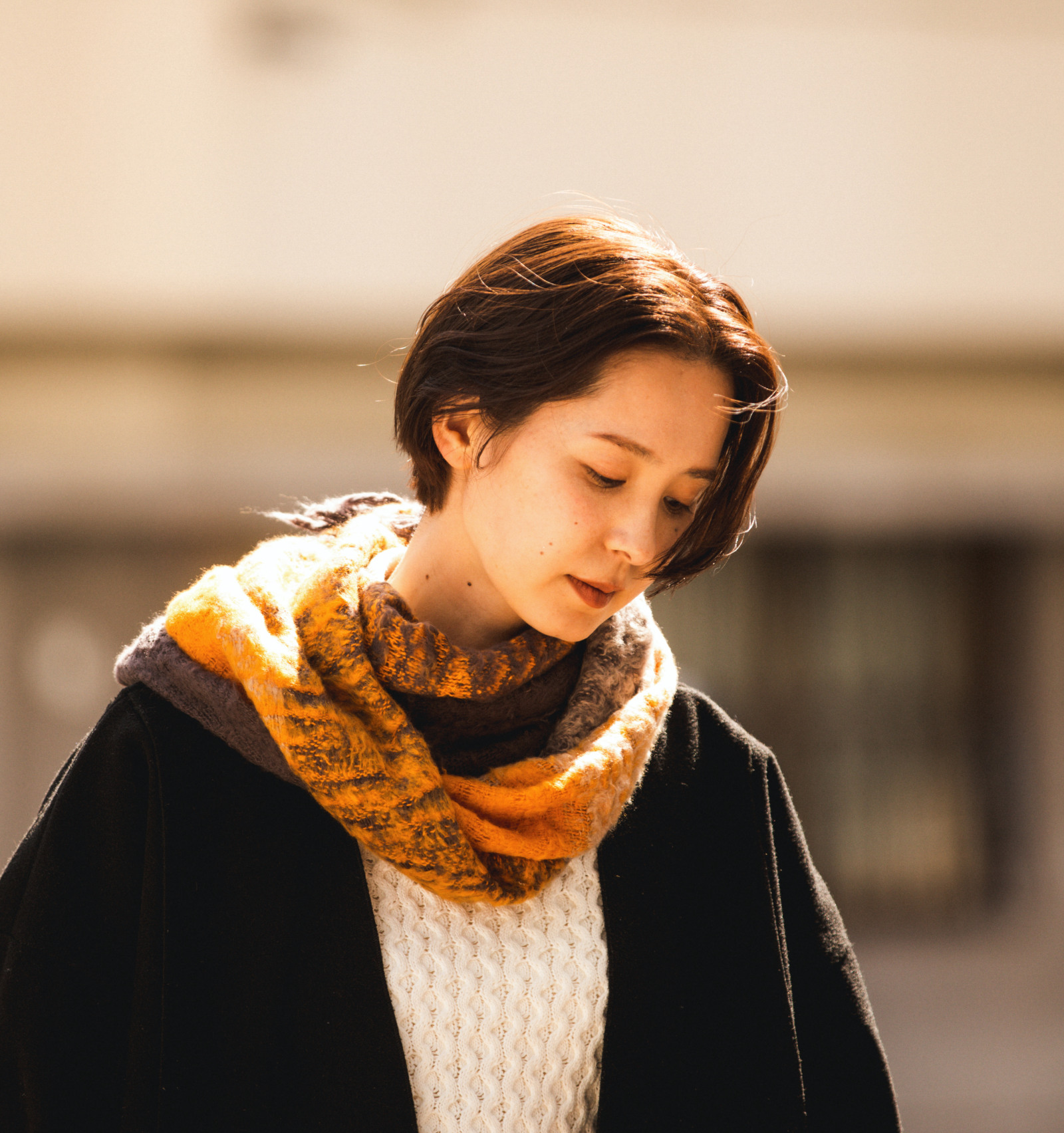 シンプルな装いのなかでも、ひと巻きで印象的に映えるバランスです。