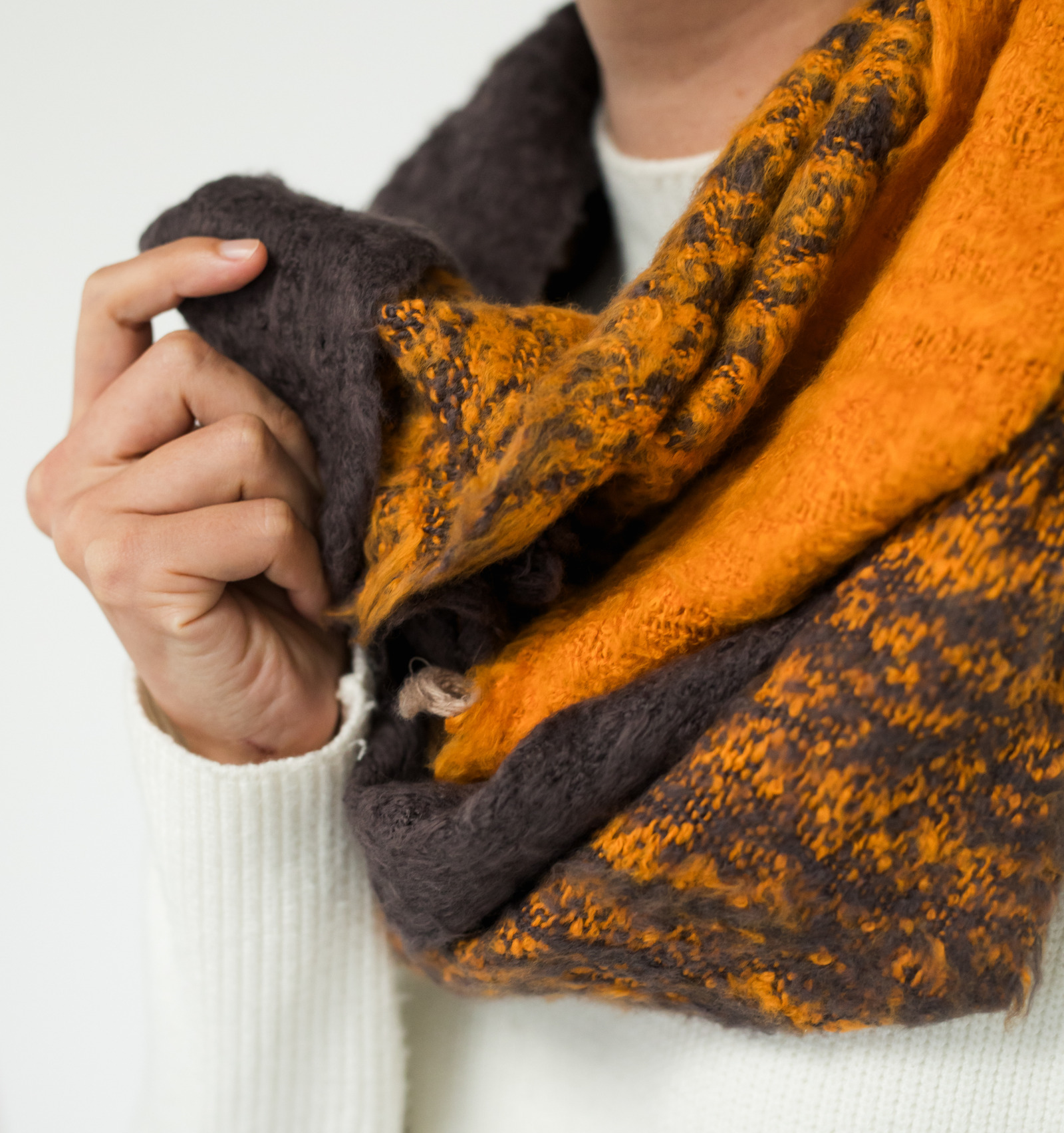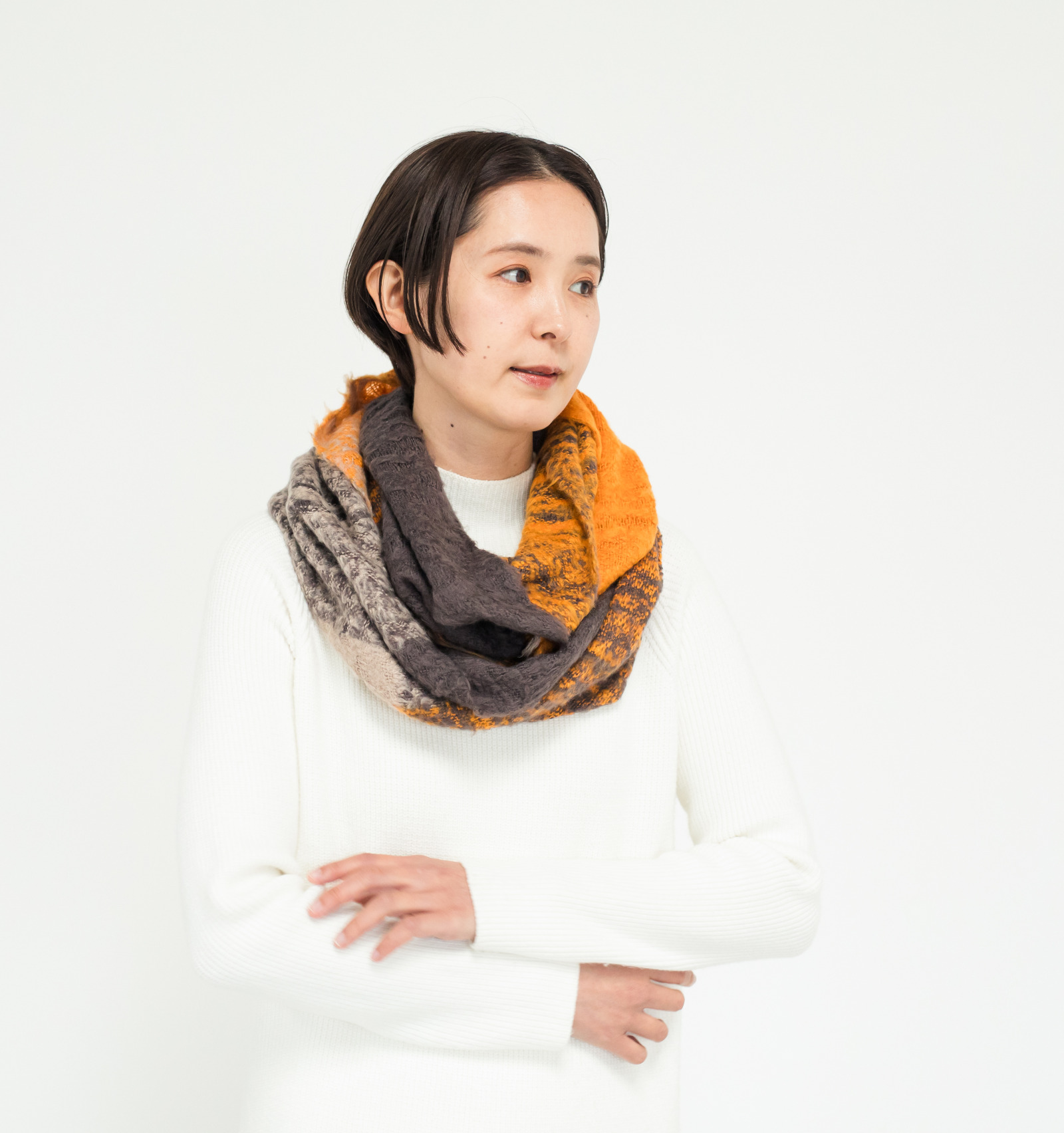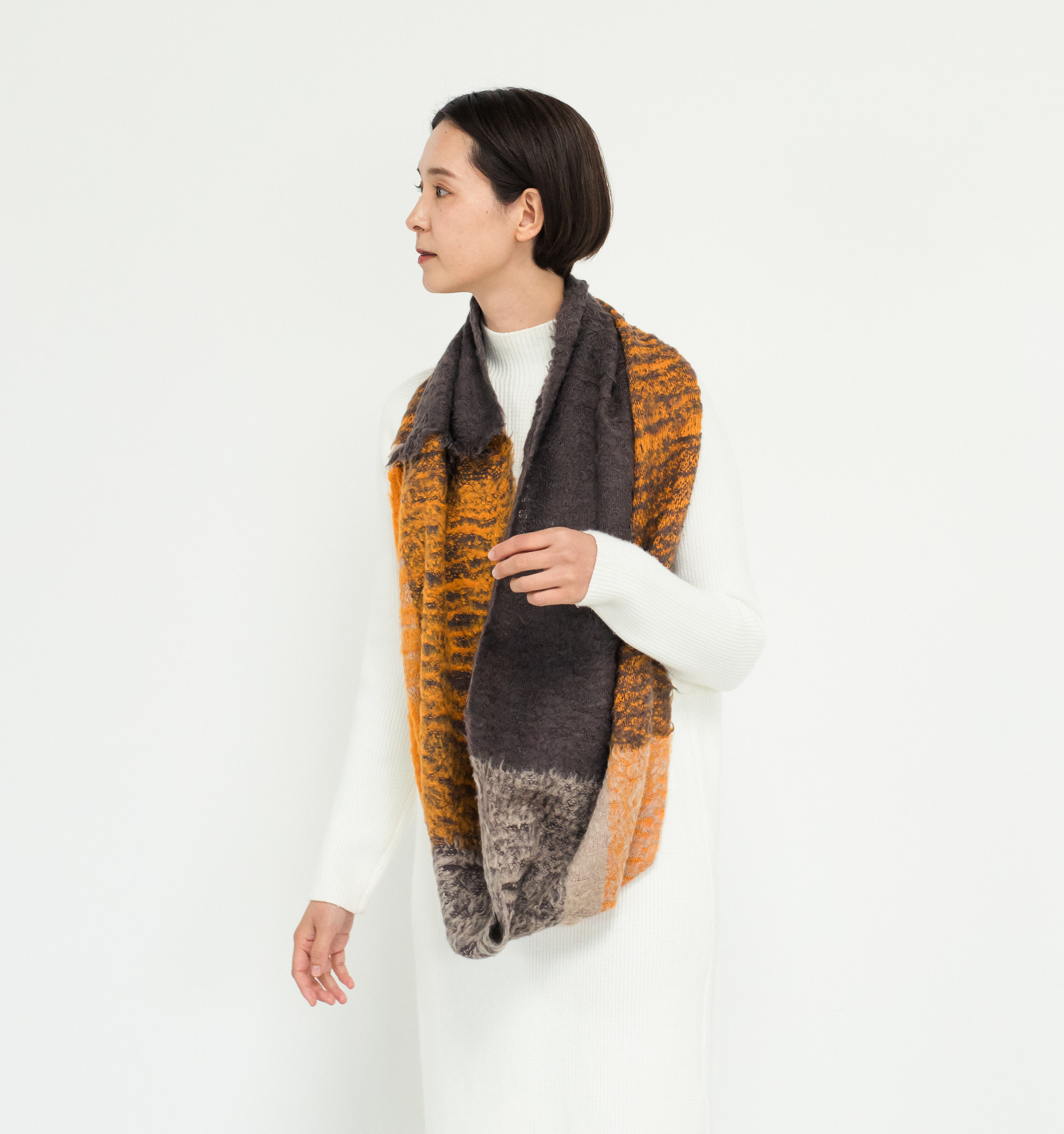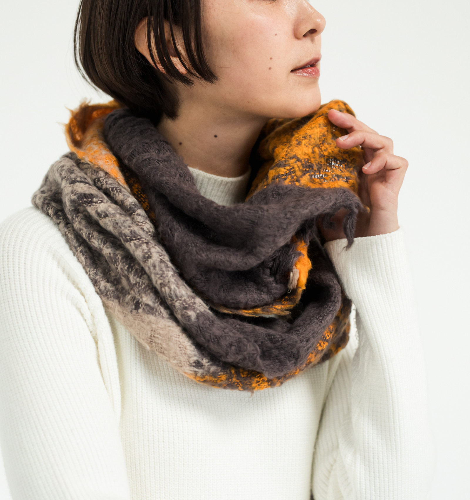 大きく巻いても、コンパクトにまとめても、ふんわりと形が決まり、日常づかいからお出かけまで、軽やかに馴染む心地よさです。