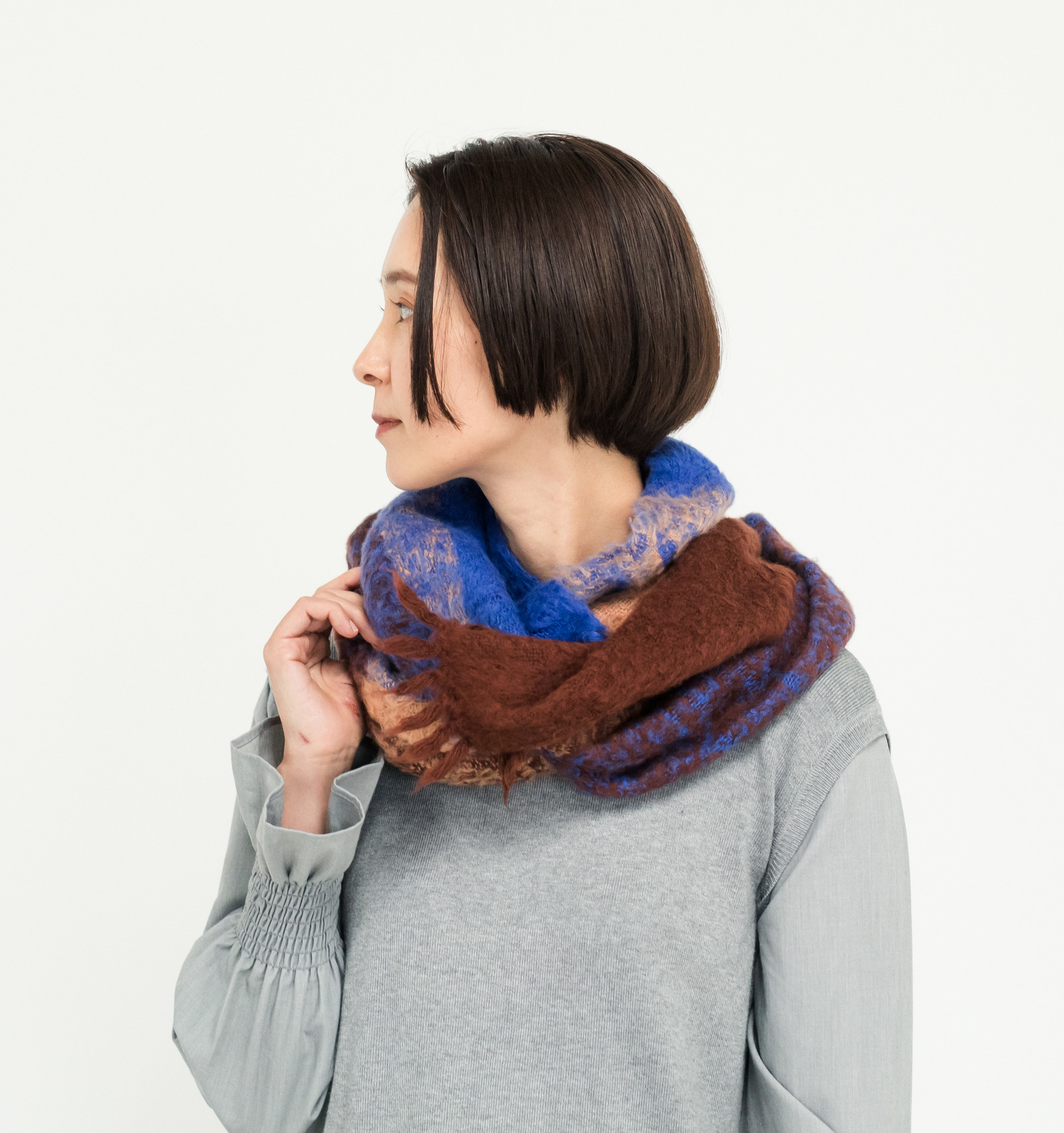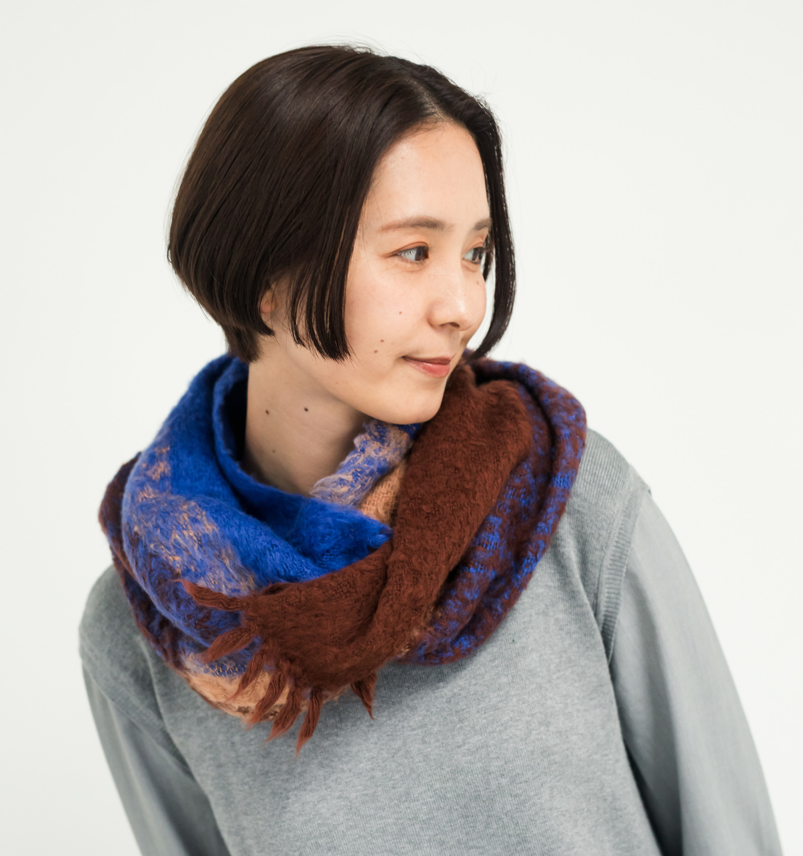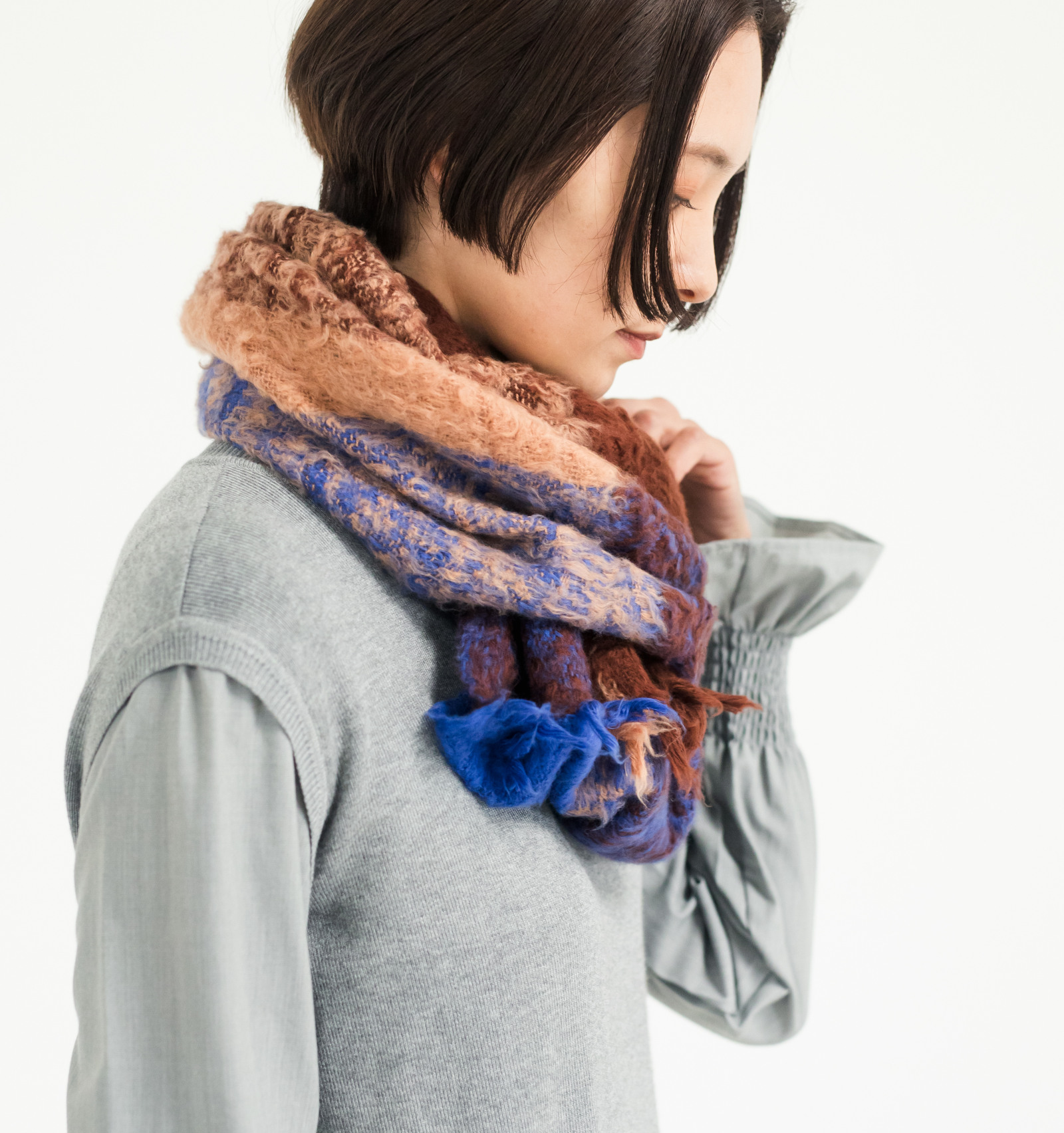 スヌードならではのアレンジが、立体的な彩りを生み出します。