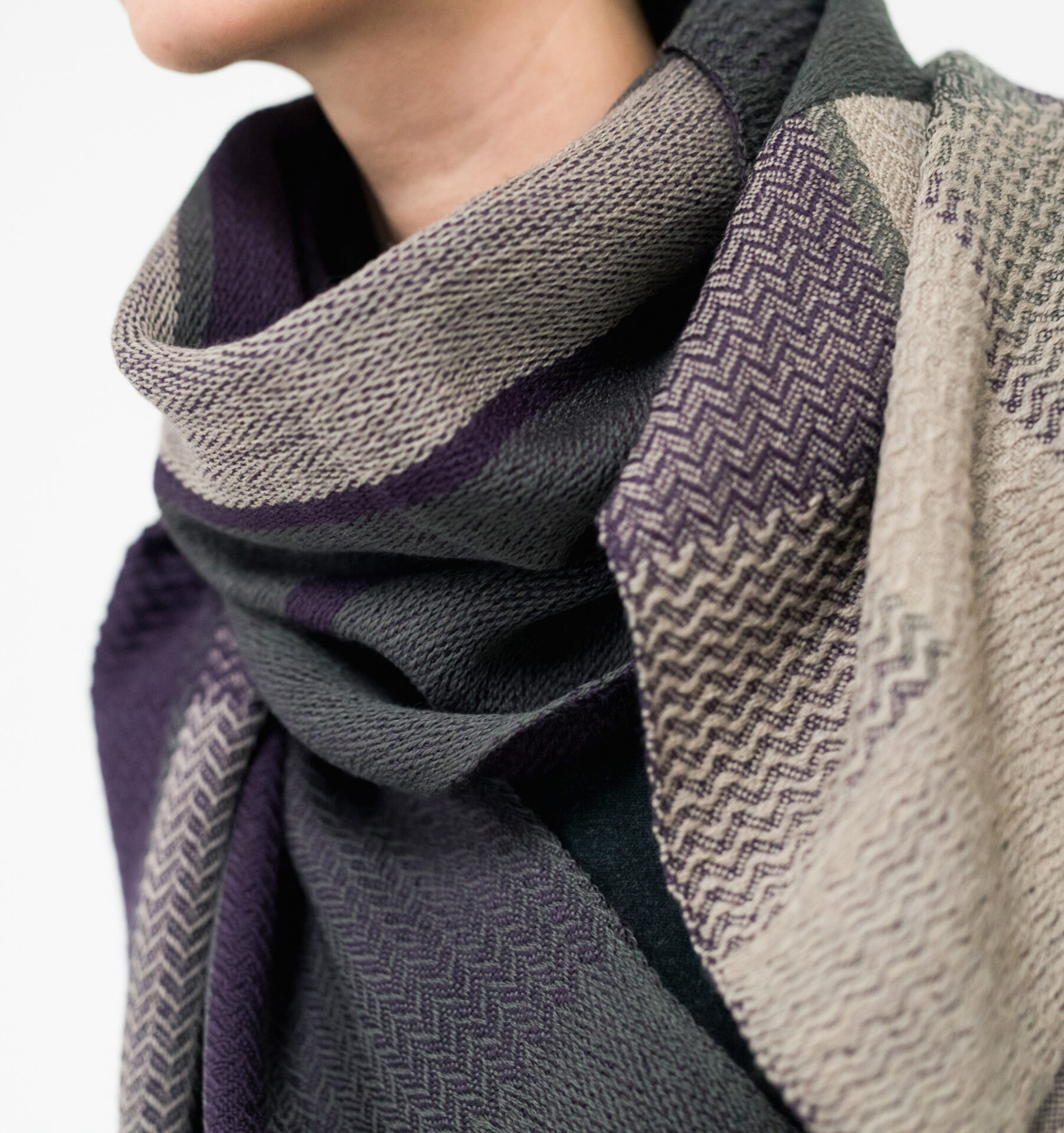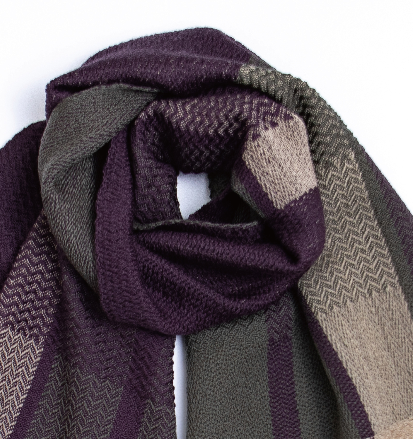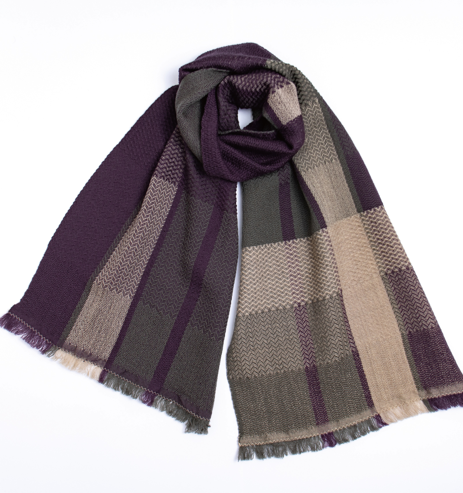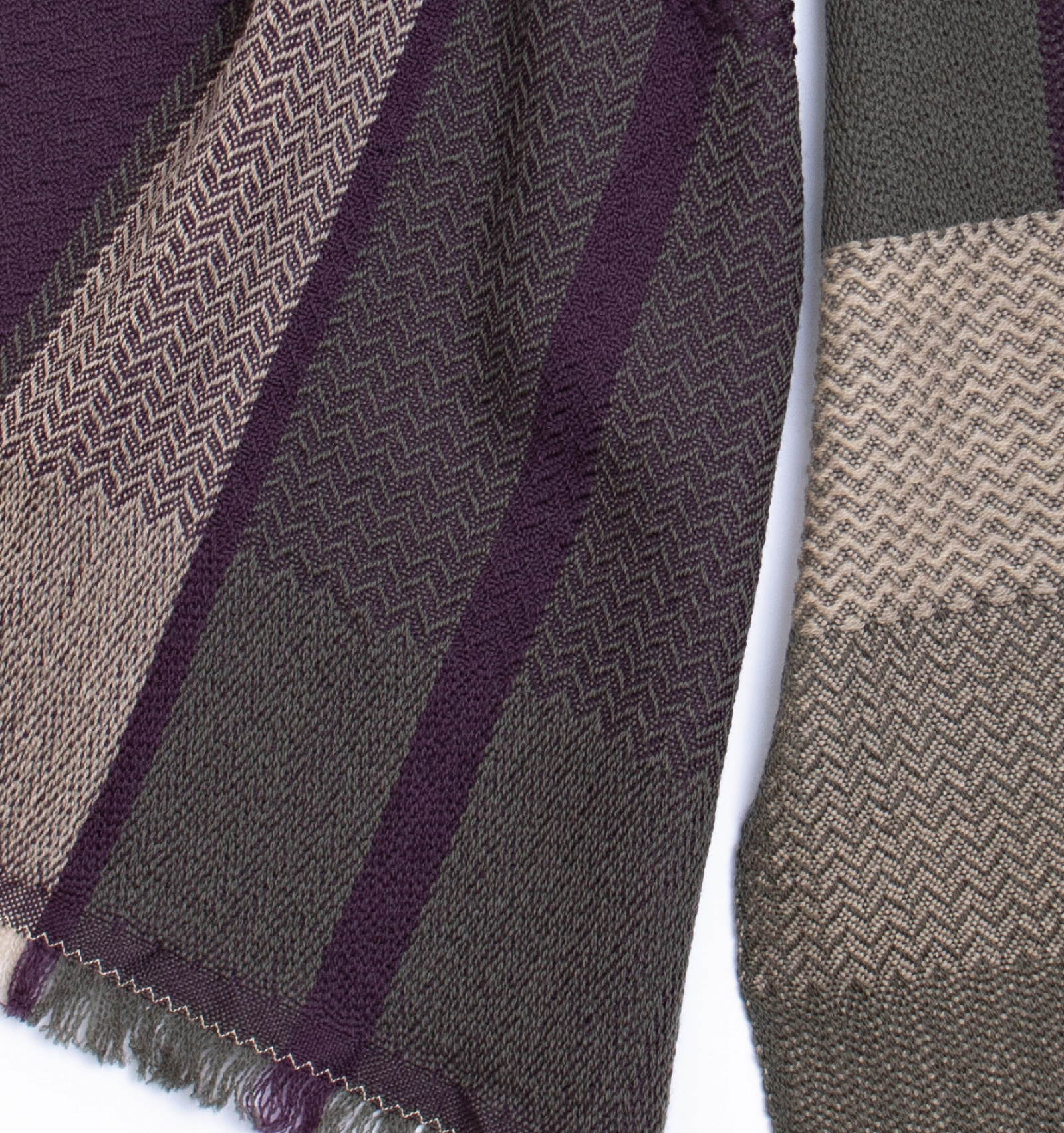 このマフラーは、シュス、へリンボーン・ワッフル・ナナコ織り、と個性豊かな4つの織り柄で作りました。