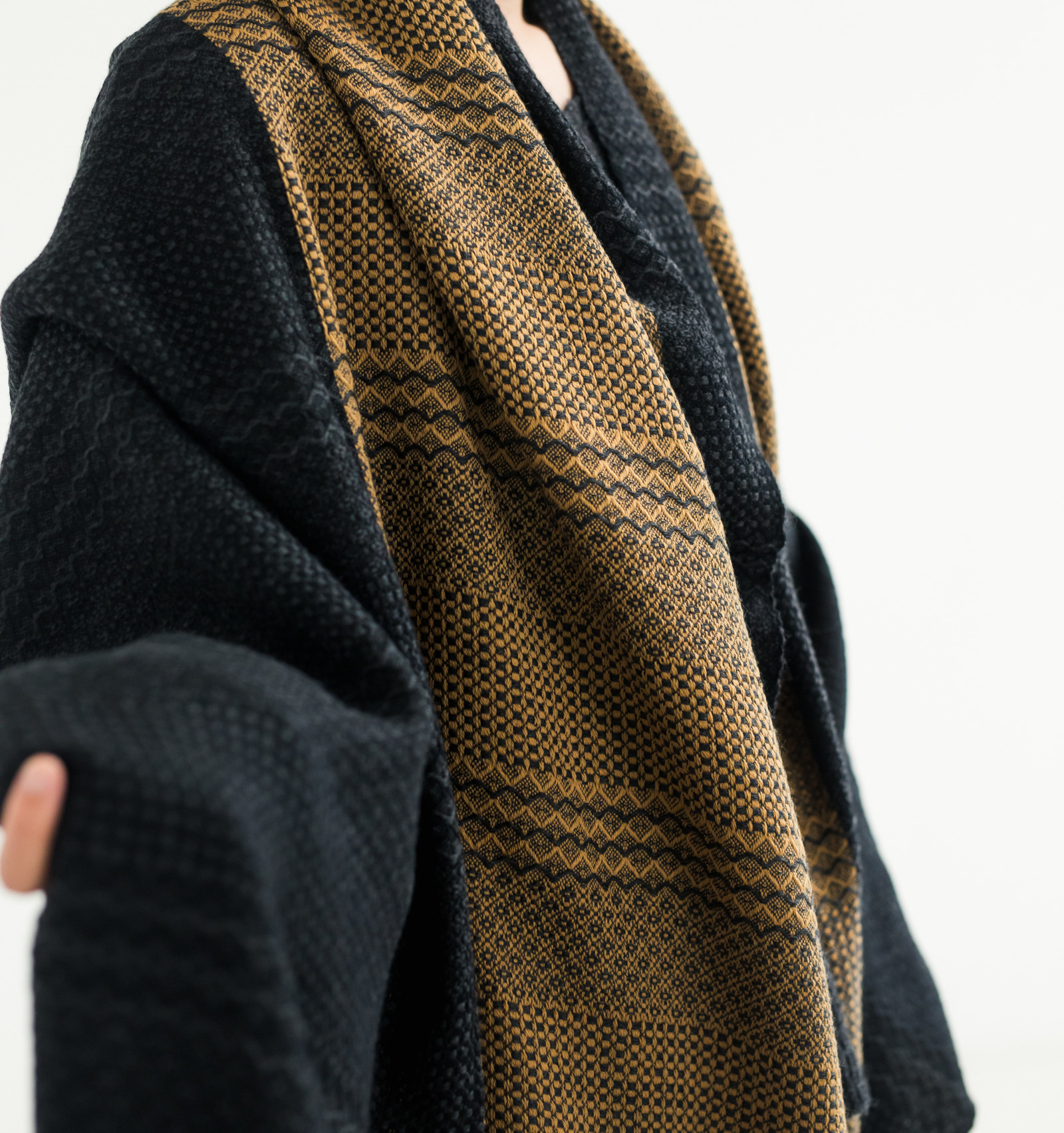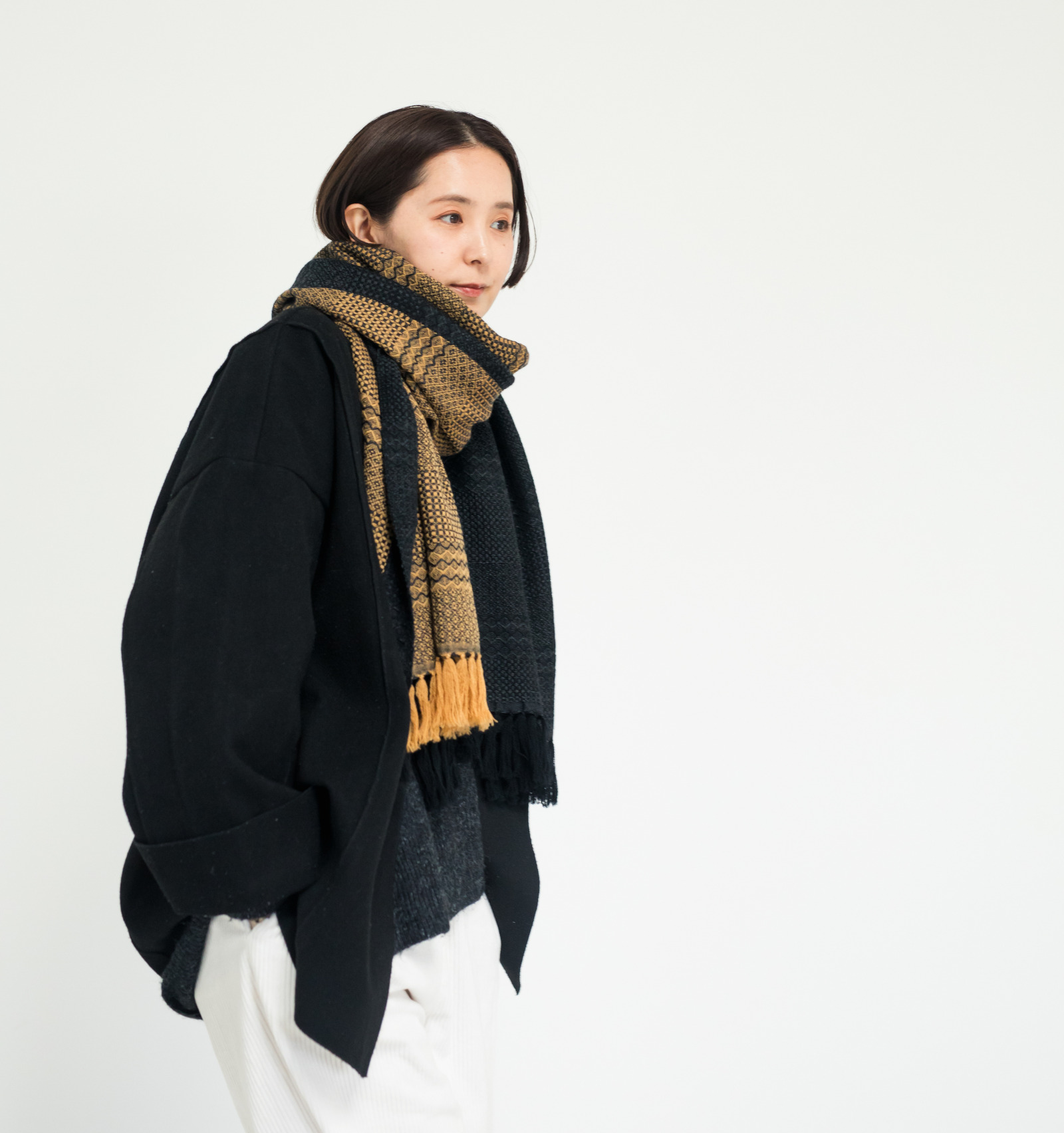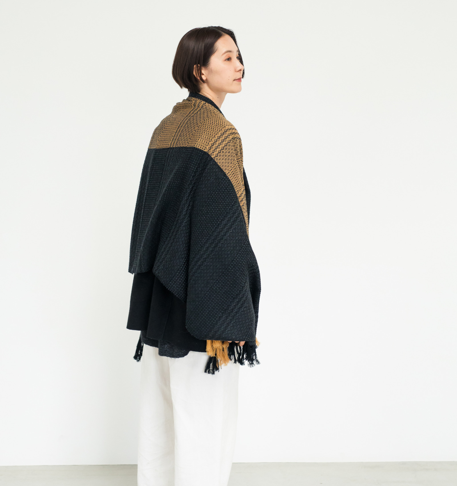 左右で色が異なるツートンカラーの構成も印象的。片側は糸のコントラストが際立ち、織模様がくっきりと浮かび上がります。もう片側は同色の糸で織り上げ、模様がそっと浮かぶように。