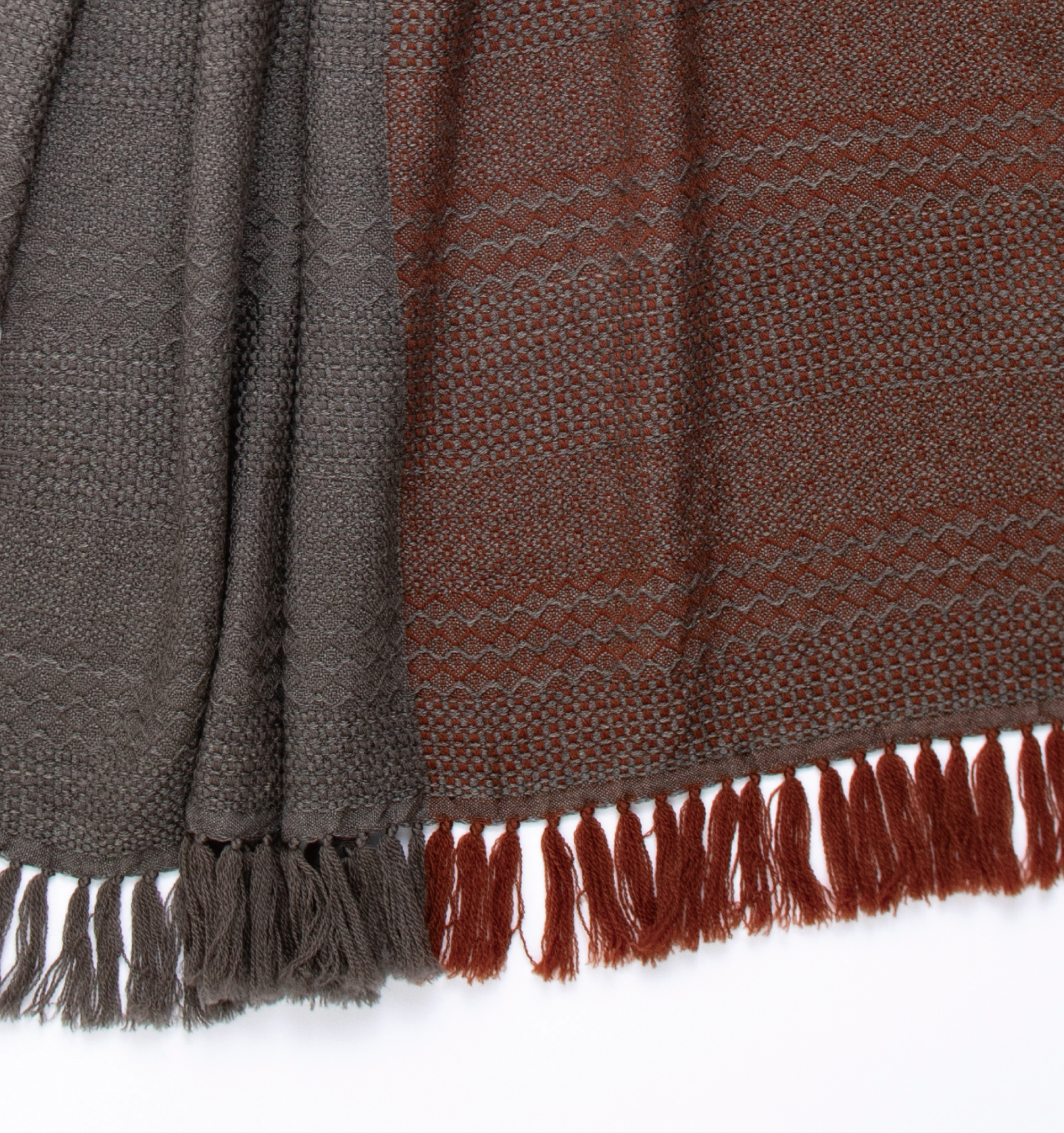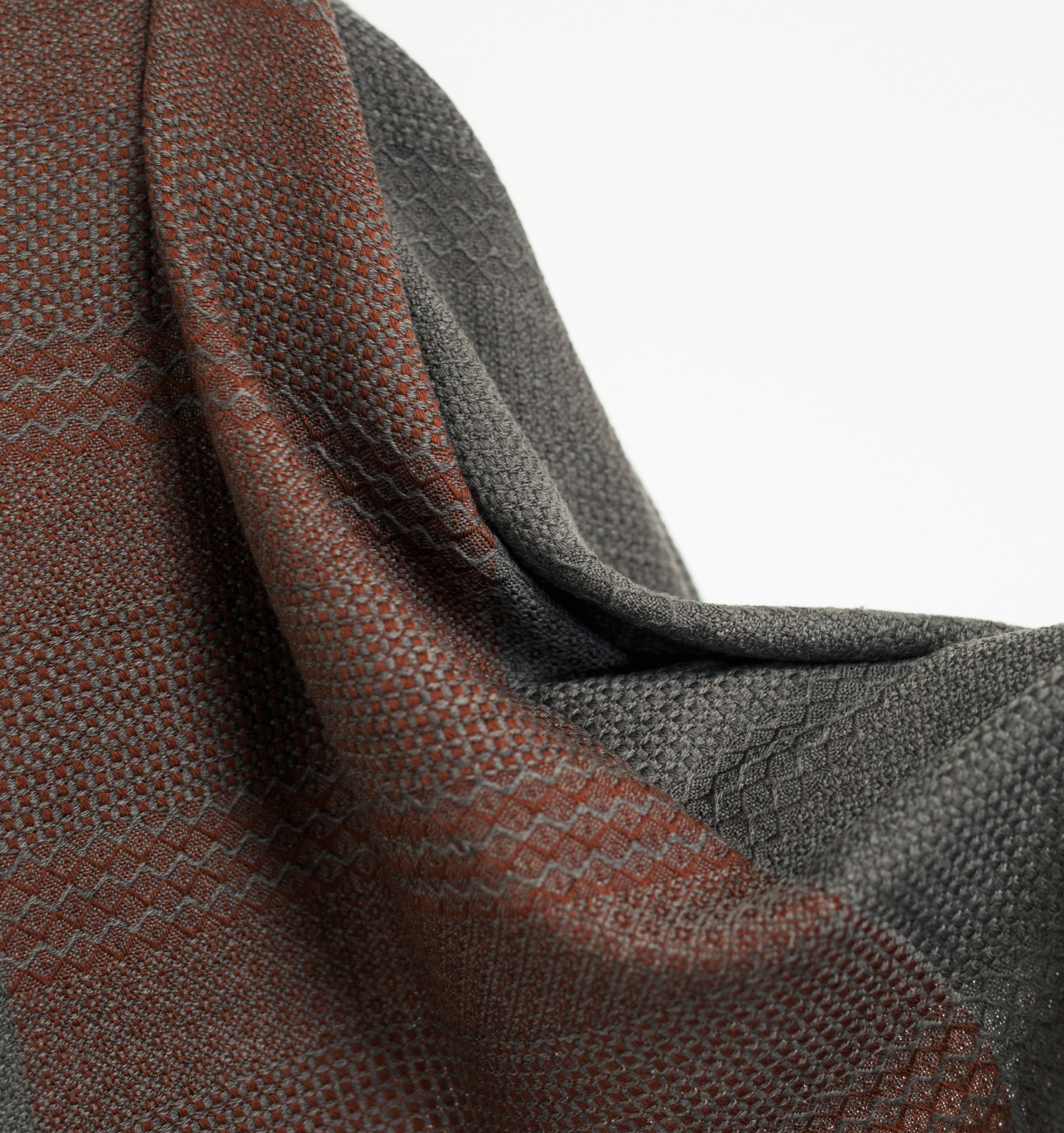 左右で色が異なるツートンカラーの構成も印象的。片側は糸のコントラストが際立ち、織模様がくっきりと浮かび上がります。もう片側は同色の糸で織り上げ、模様がそっと浮かぶように。
