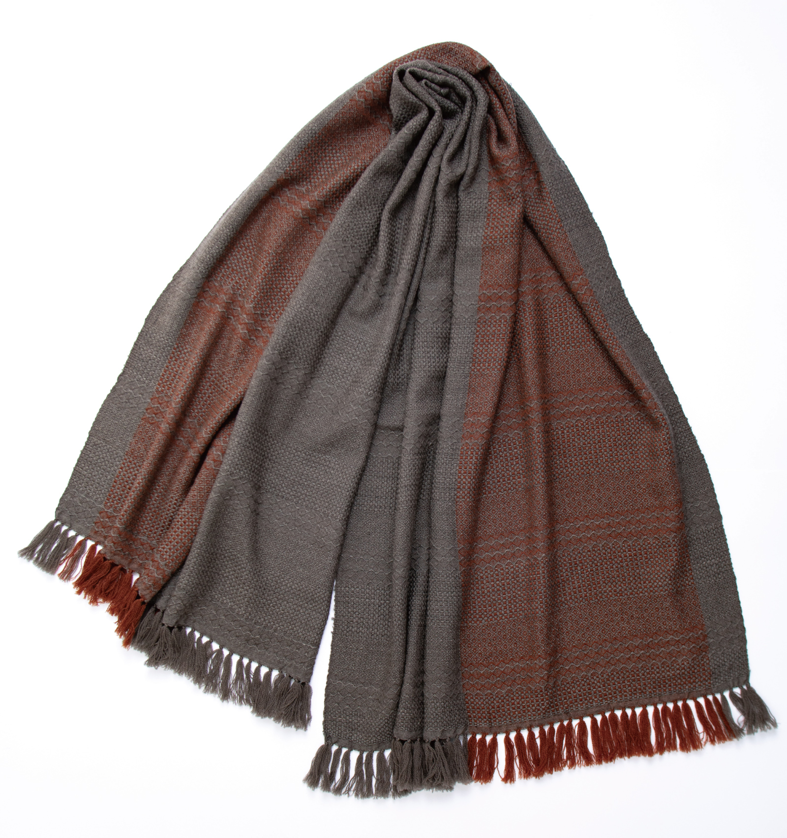 このショールは、昭和の時代に活躍していたシャトル織機で、一枚ずつ丁寧に織り上げています。