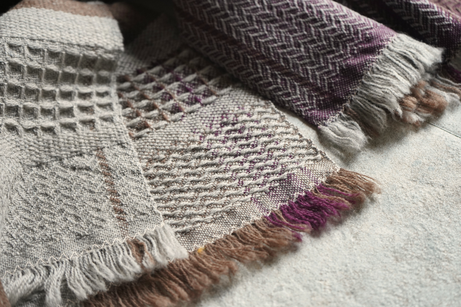 蜂巣・朱子・ヘリンボン・ナナコ織りなど複数の変化組織を組み合わせた織り方です。生地に複雑な柄と立体感と厚みが出ます。同じ色を通しても、組織の違いにより見え方や表情にバリエーションが生まれます。