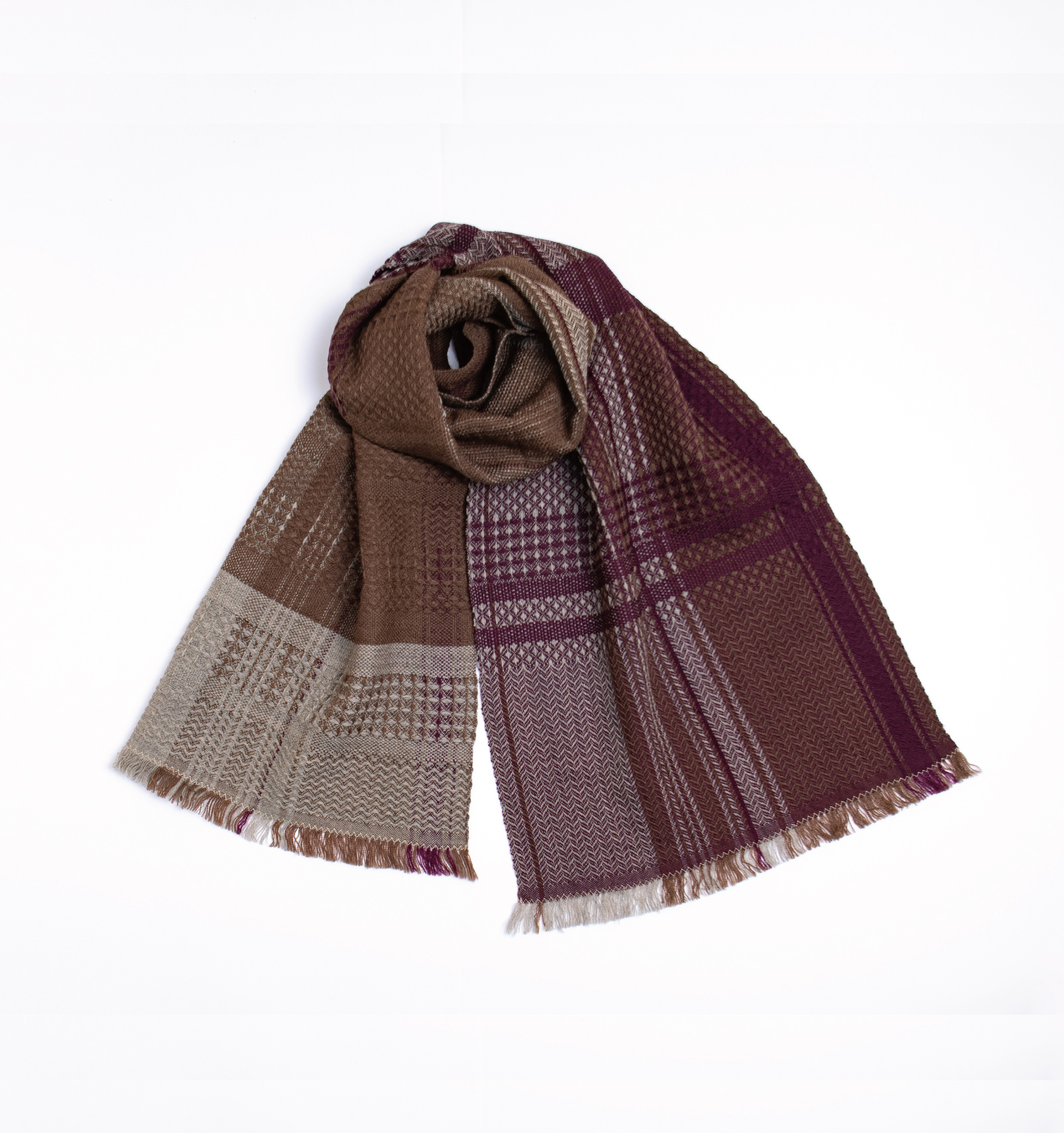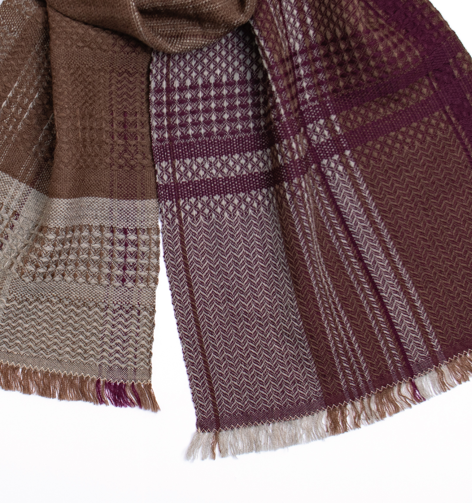 ヘリンボーン・ワッフル・シュス・ナナコ織り。異なる4つの織り柄が連なり、表情が移ろう構成は、2013年の誕生時から変わらないものです。試作を重ねて辿り着いた“完成された組み合わせ”で、時を経ても古びず、今もなお心をとらえる奥行きを持ち続けています。