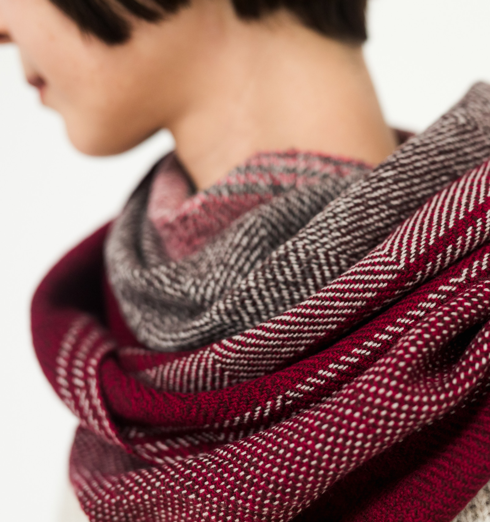 首に通すだけでもさまになり、小さな輪に布を通したり反転させたりするだけで、表情がやわらかく変化。