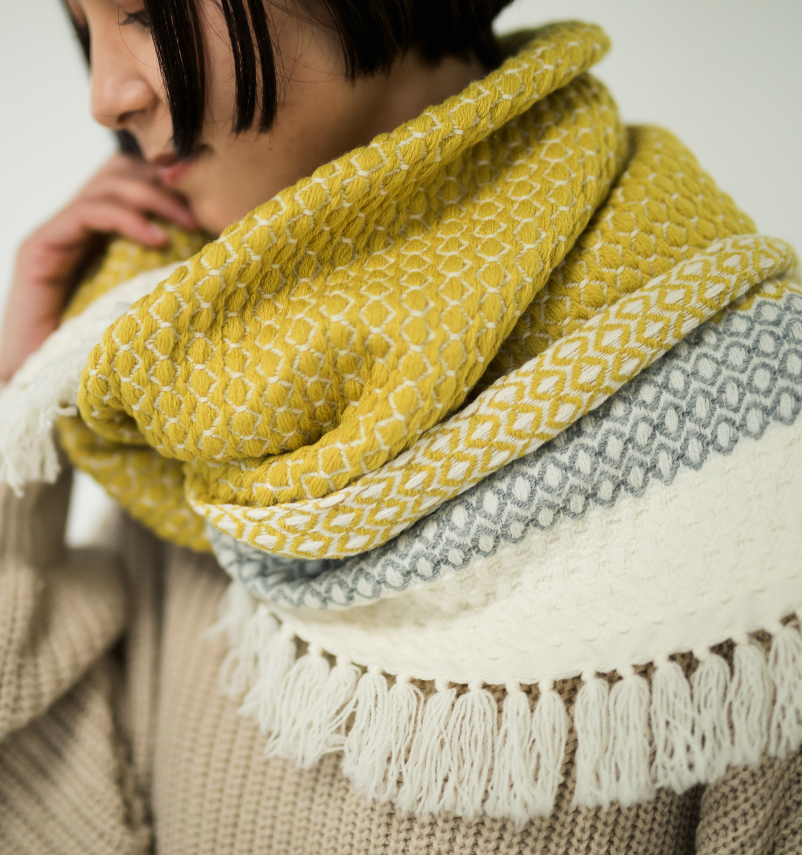 マフラーづくりを続けてきた工房織座だからこそ、巻いたときのしなやかさにもこだわりました。