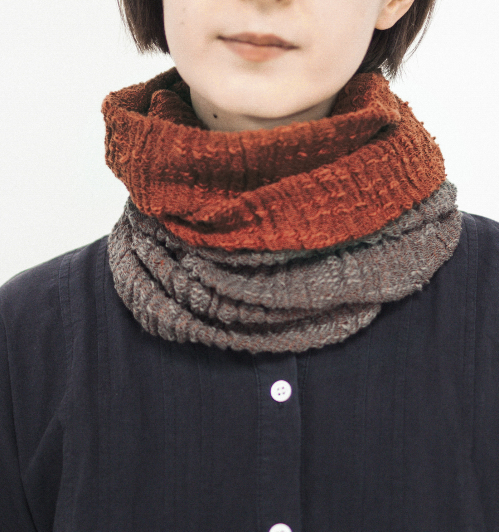 約80cmの筒状の生地が、首をしっかりと包み込んでくれます。色の魅せ方を変えることで、ネックウォーマーとしてもリバーシブルを愉しめます。