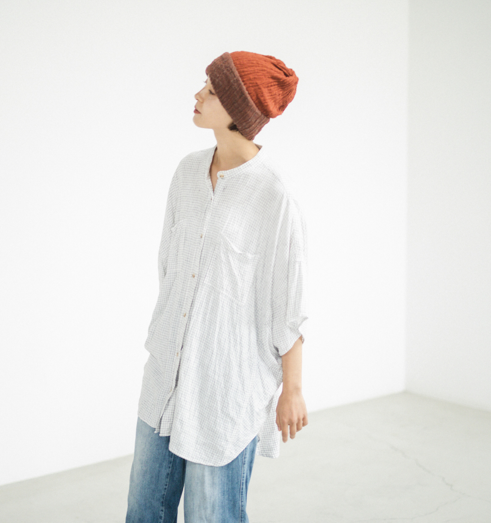 折り返したスタンダードな帽子。「ひたい」の部分に、どちらの色が来るかで随分と印象が変わります。