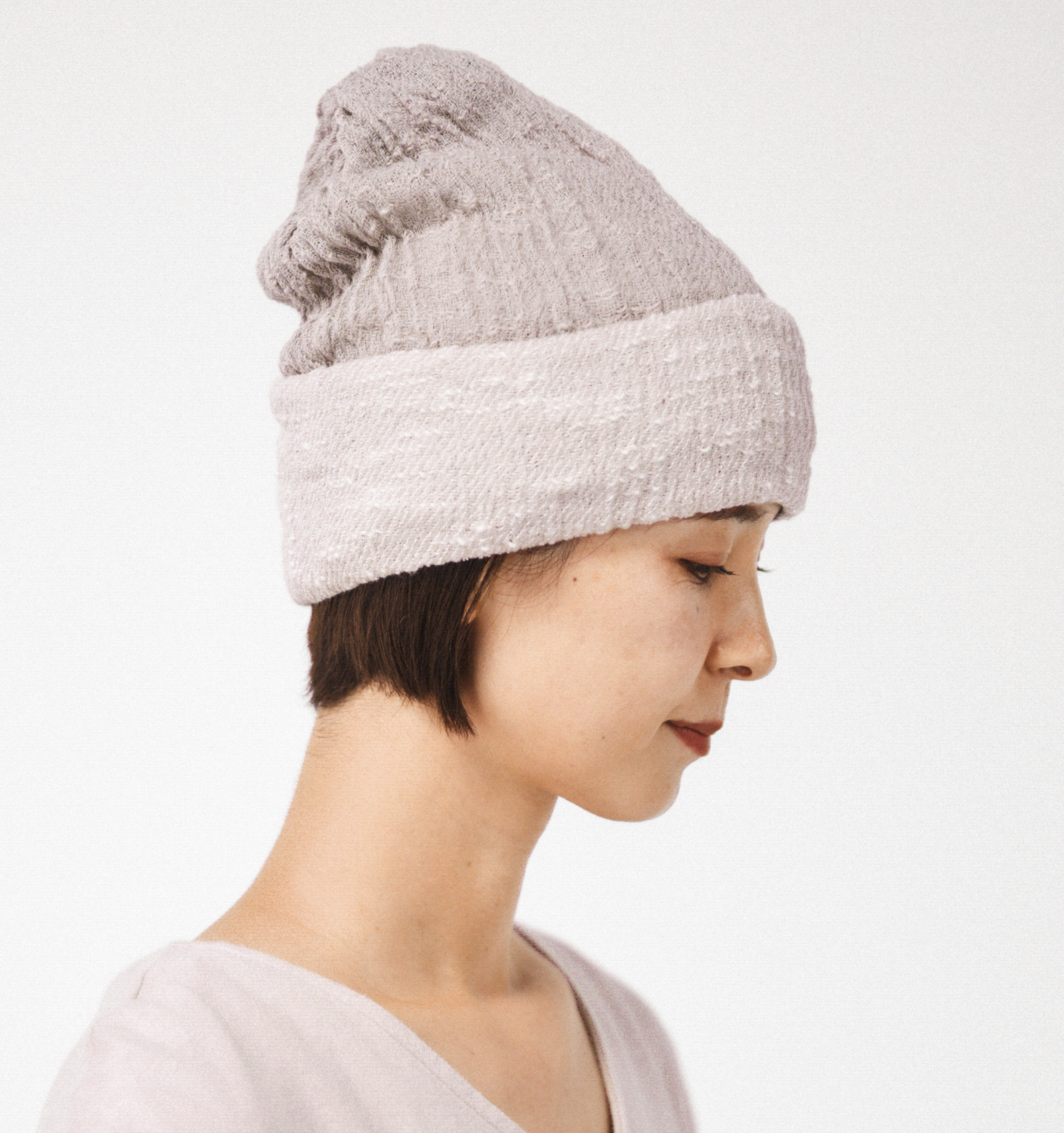 生地そのものにゴムを使わず、糸の撚りによって自然な伸縮性を持たせています。きつく締め付ける感じがなく、頭の形にふんわりとなじむフィット感。締め付け感が苦手な方でも、無理なく使い続けられるのがうれしいポイントです。