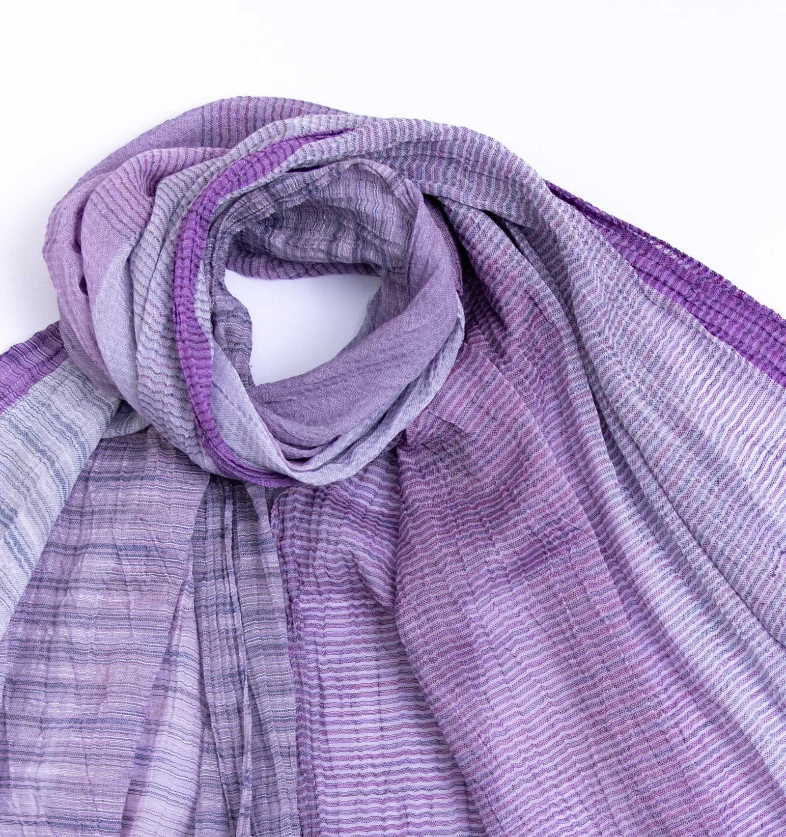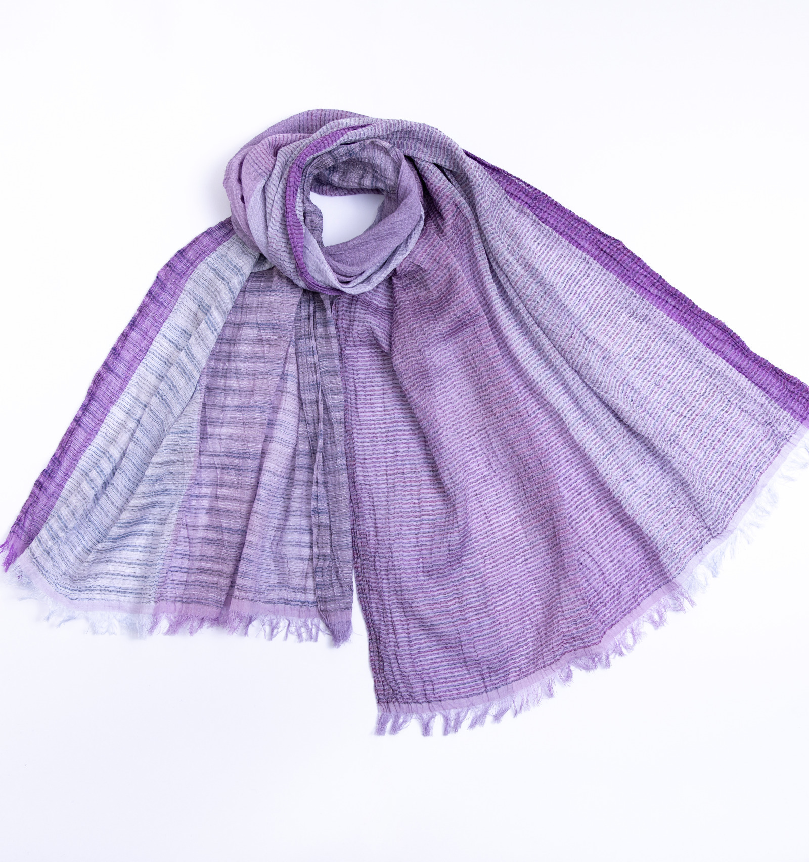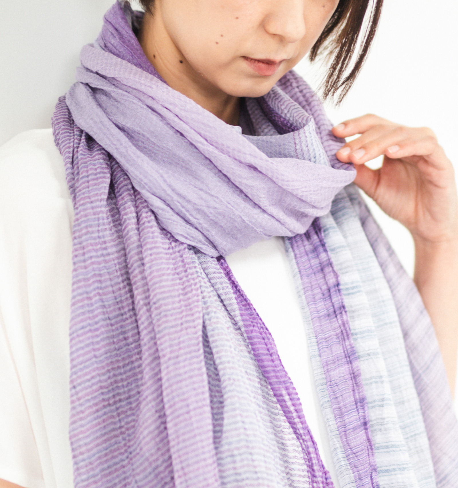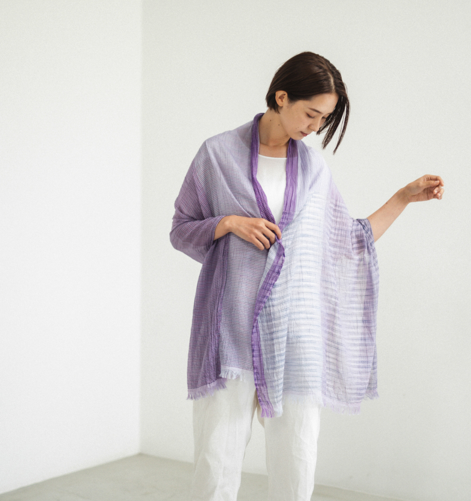 紗染めのやわらかな色の移ろいと、絣糸の繊細な表情が重なり合い、単色にはない奥行きが生まれます。巻き方や重なり方によって、現れる色の濃淡がさりげなく変わり、その都度ちがった表情に。