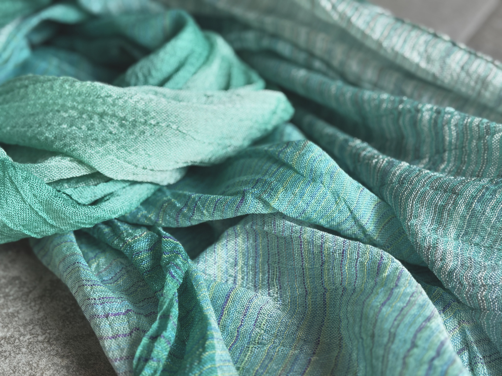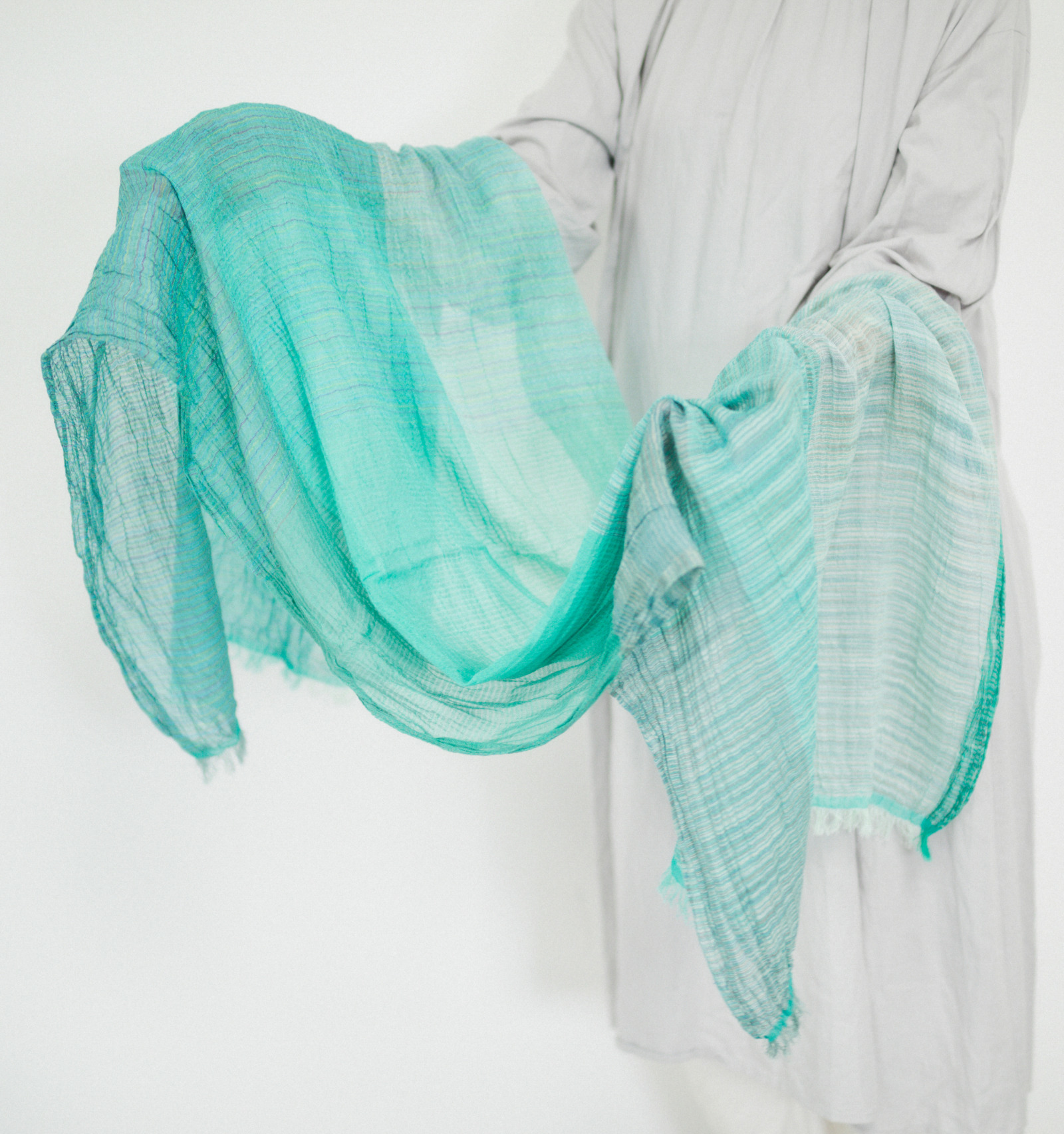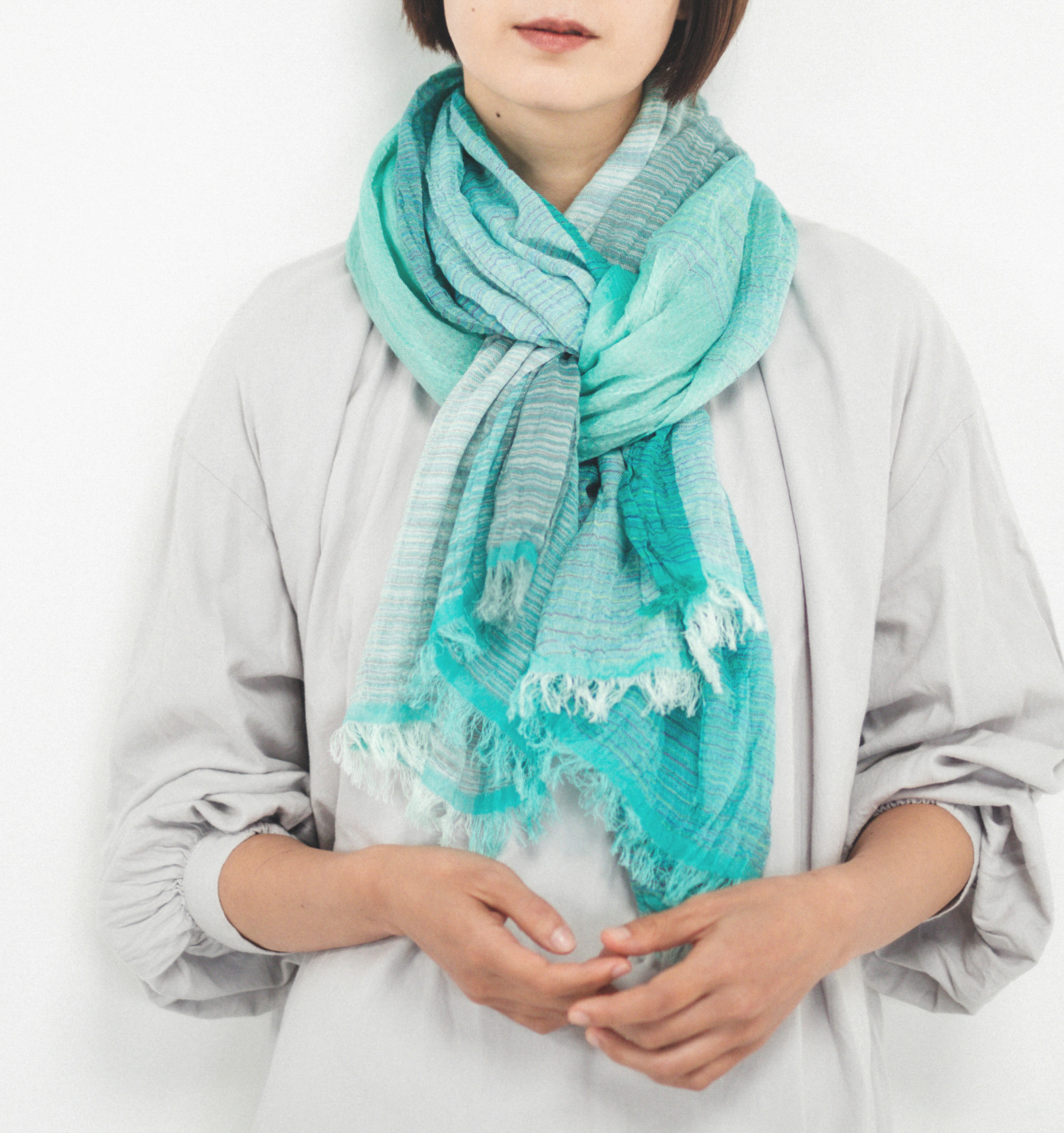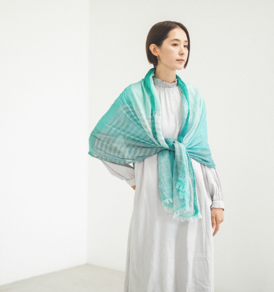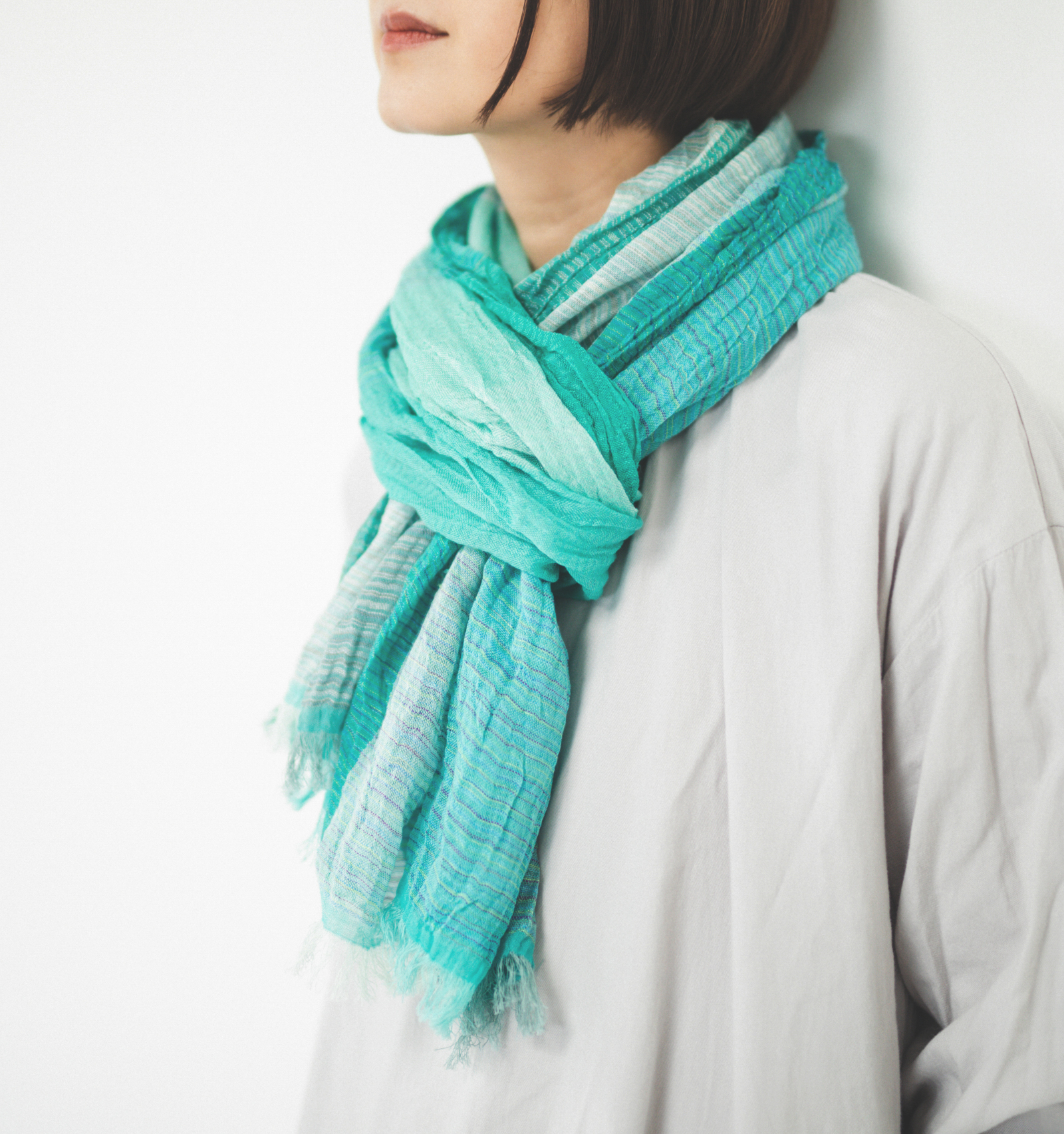 紗染めのやわらかな色の移ろいと、絣糸の繊細な表情が重なり合い、単色にはない奥行きが生まれます。巻き方や重なり方によって、現れる色の濃淡がさりげなく変わり、その都度ちがった表情に。