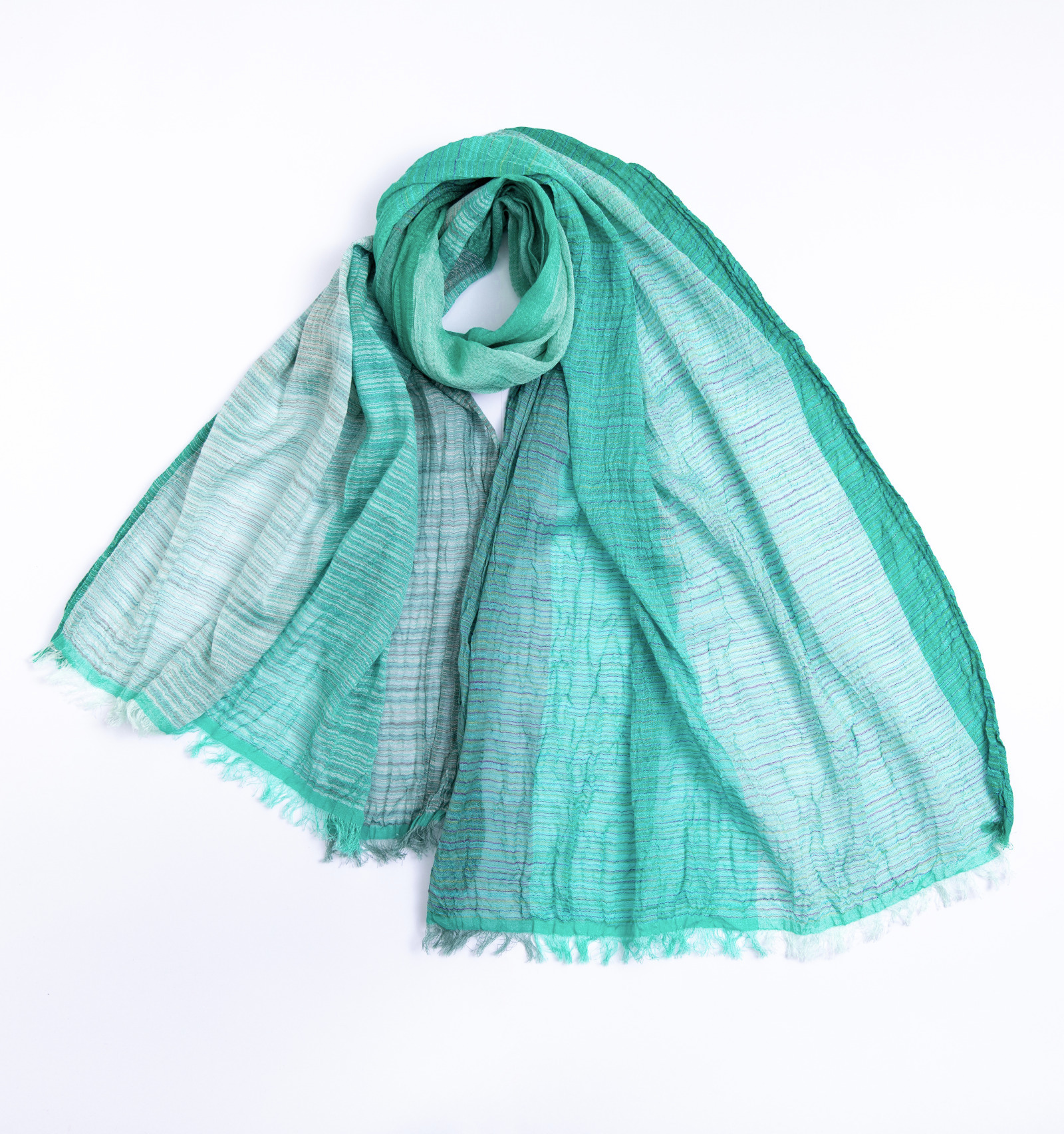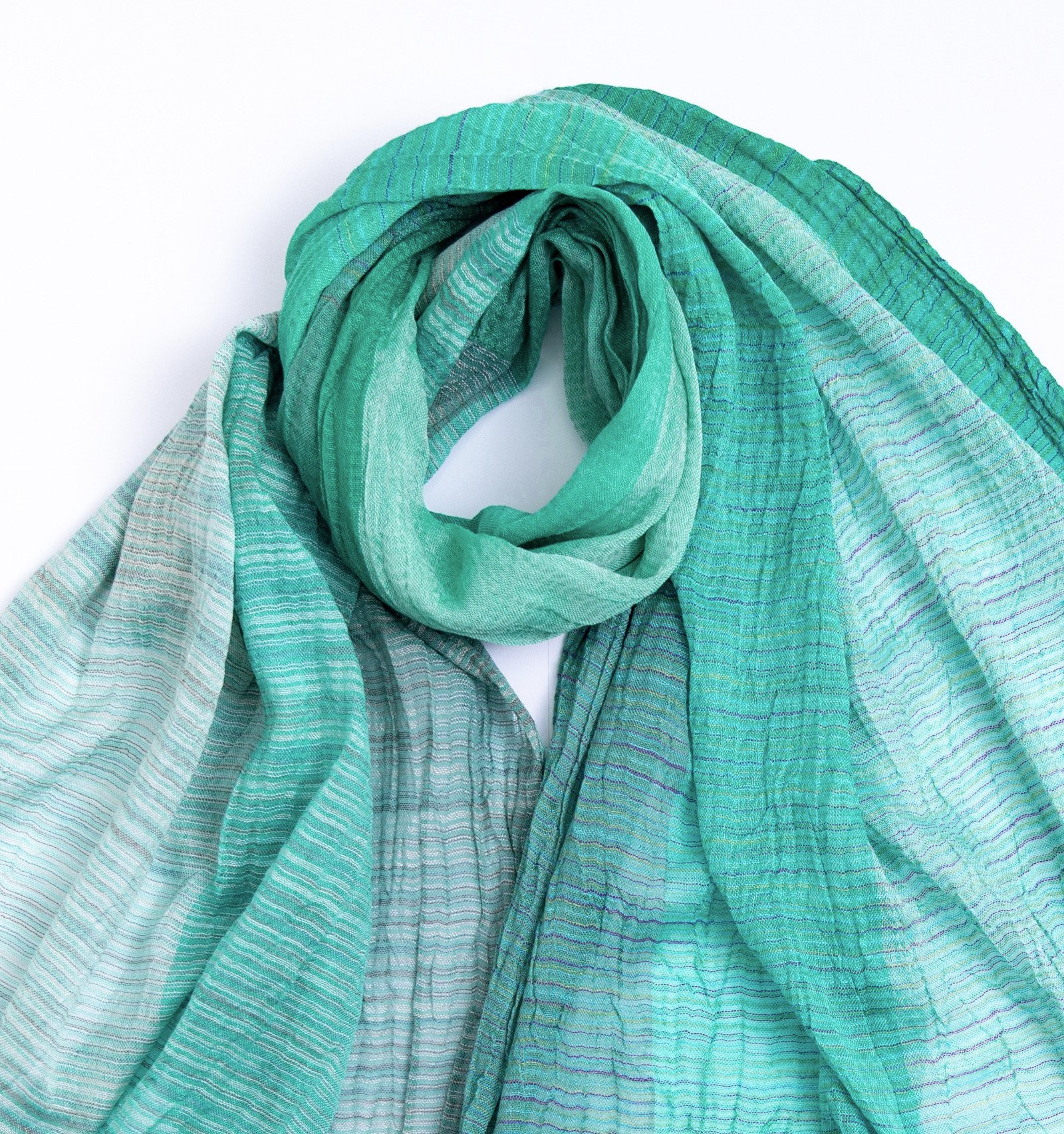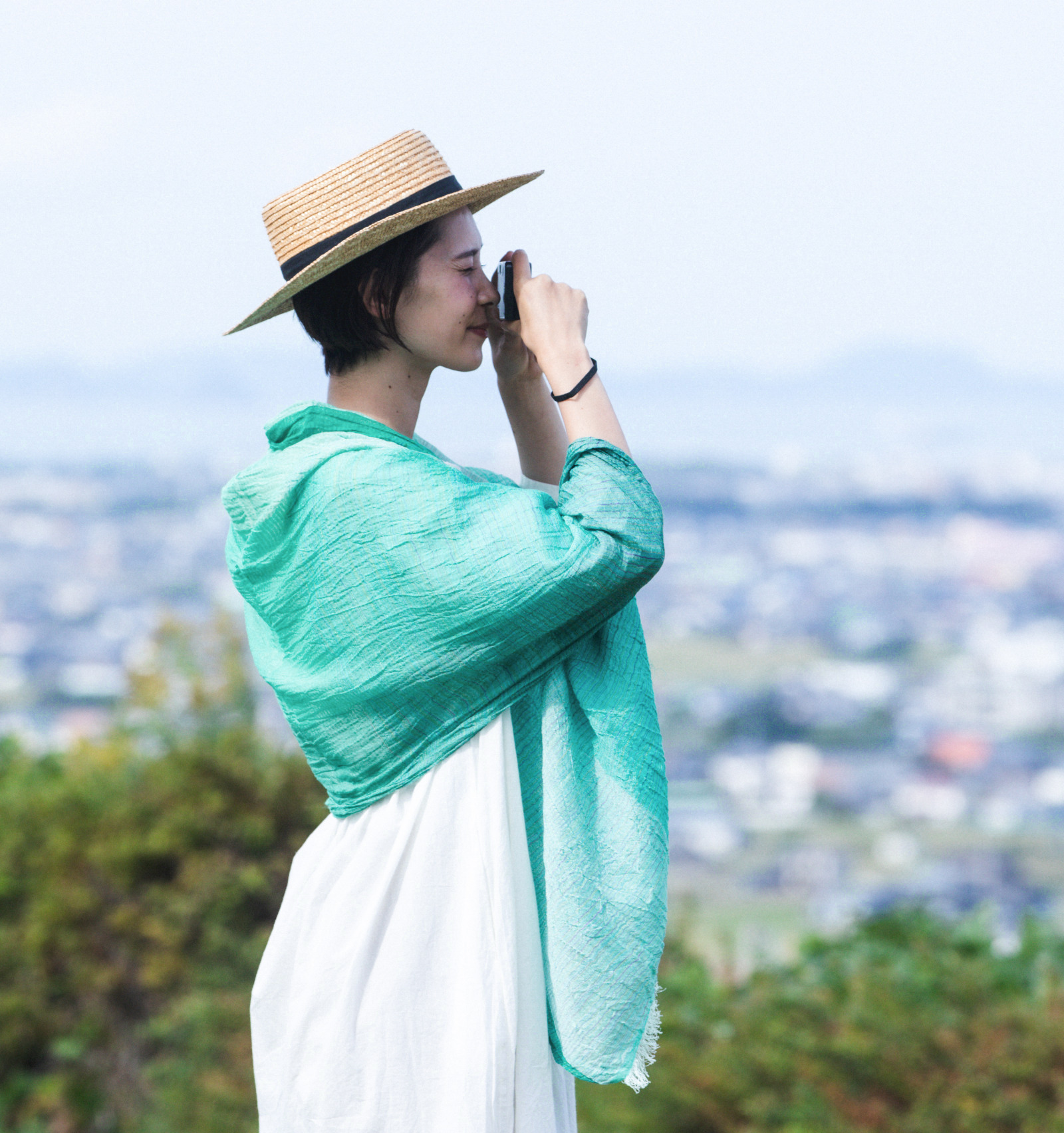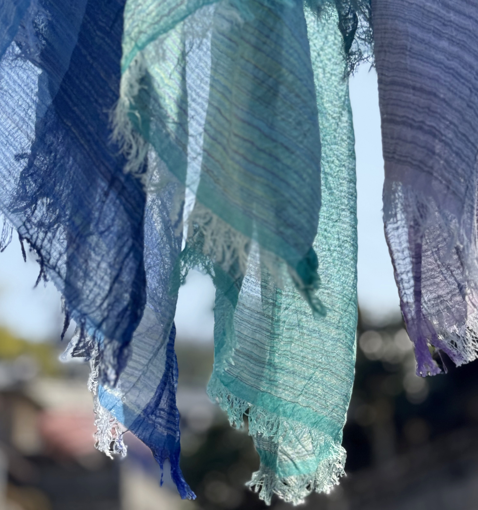 紗染めのやわらかな色の移ろいと、絣糸の繊細な表情が重なり合い、単色にはない奥行きが生まれます。巻き方や重なり方によって、現れる色の濃淡がさりげなく変わり、その都度ちがった表情に。