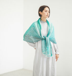 伸縮性のある大判生地は、くしゅっと無造作に巻くだけで自然なボリュームが生まれます。重ねた布のあいだに空気の層ができ、その空気が体温でほんのりとあたたまり、やわらかく包み込むような感覚に。見た目は涼やかでも、春先のまだ肌寒さが残る頃に心強い存在です。