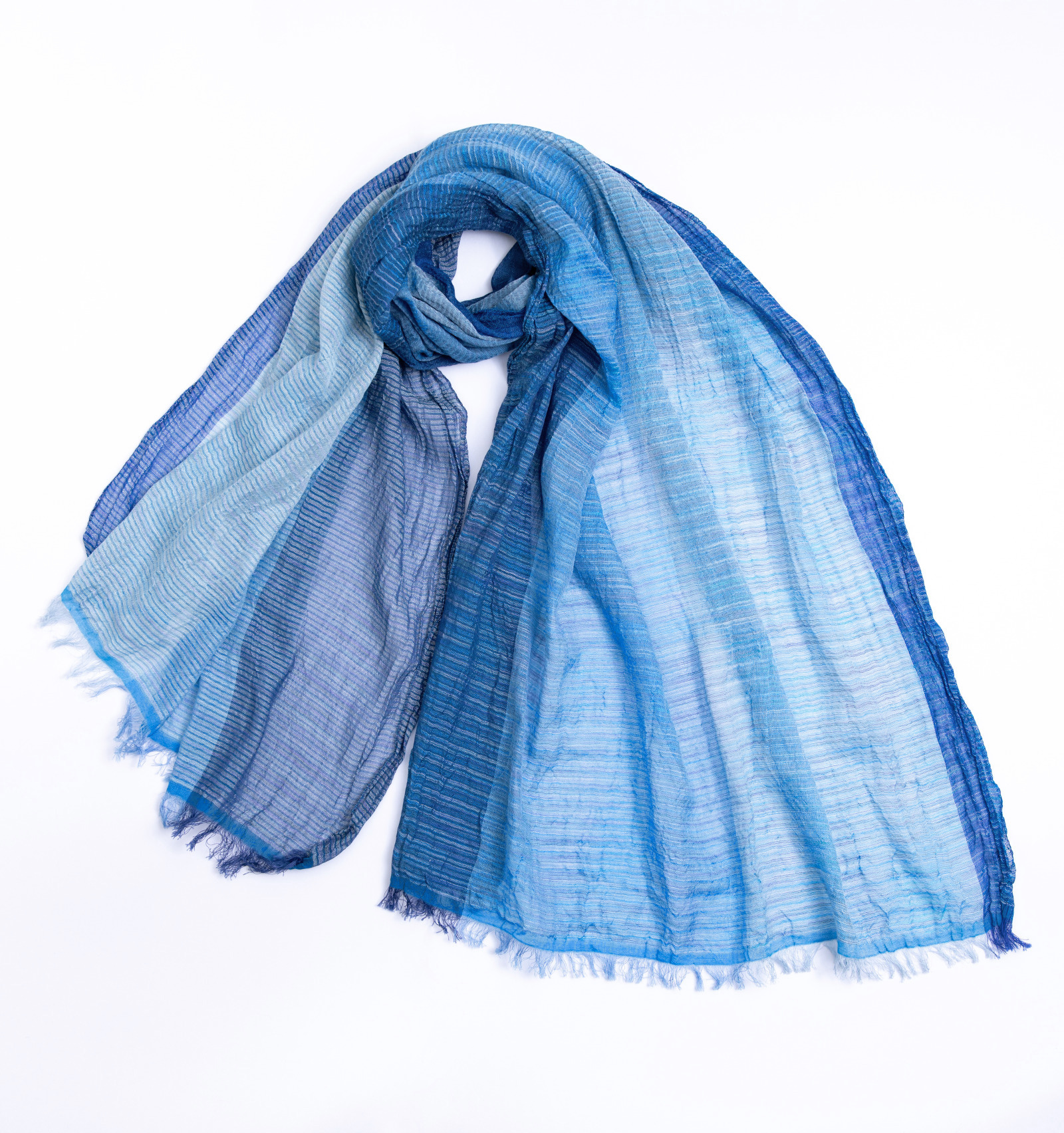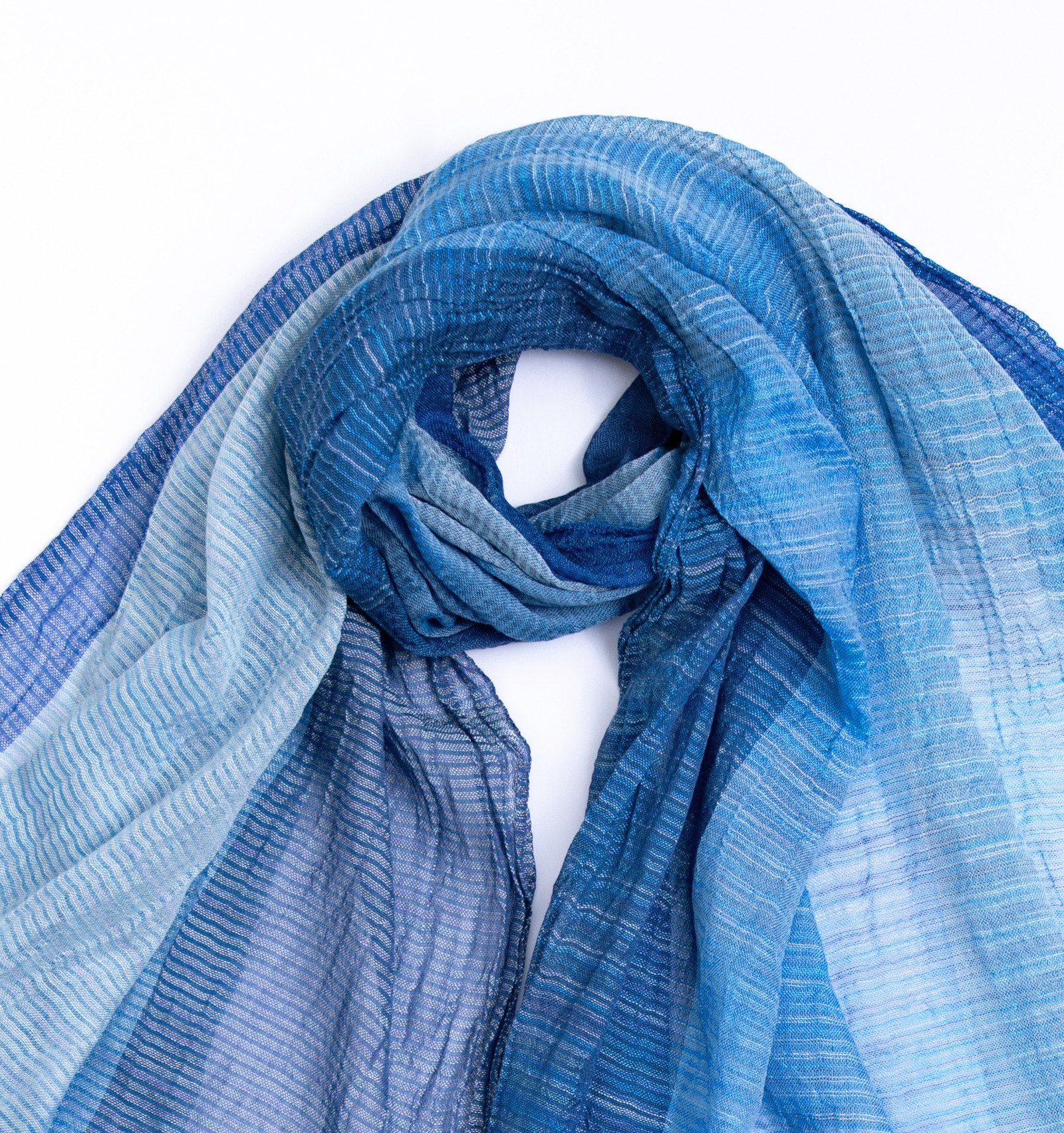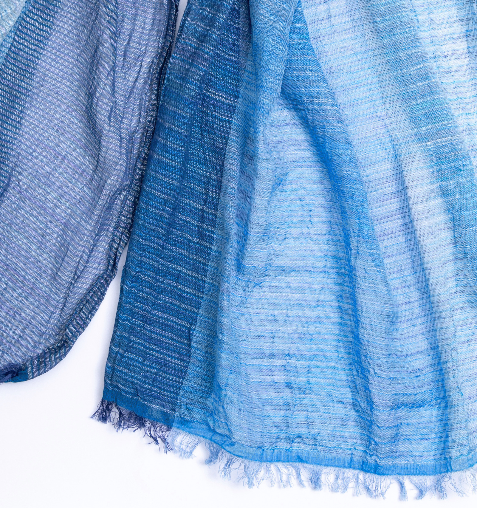 紗染めのやわらかな色の移ろいと、絣糸の繊細な表情が重なり合い、単色にはない奥行きが生まれます。巻き方や重なり方によって、現れる色の濃淡がさりげなく変わり、その都度ちがった表情に。