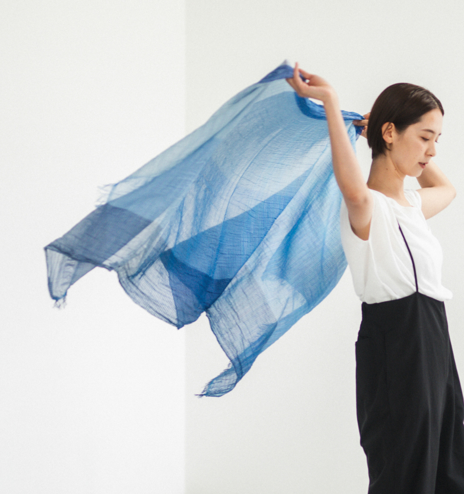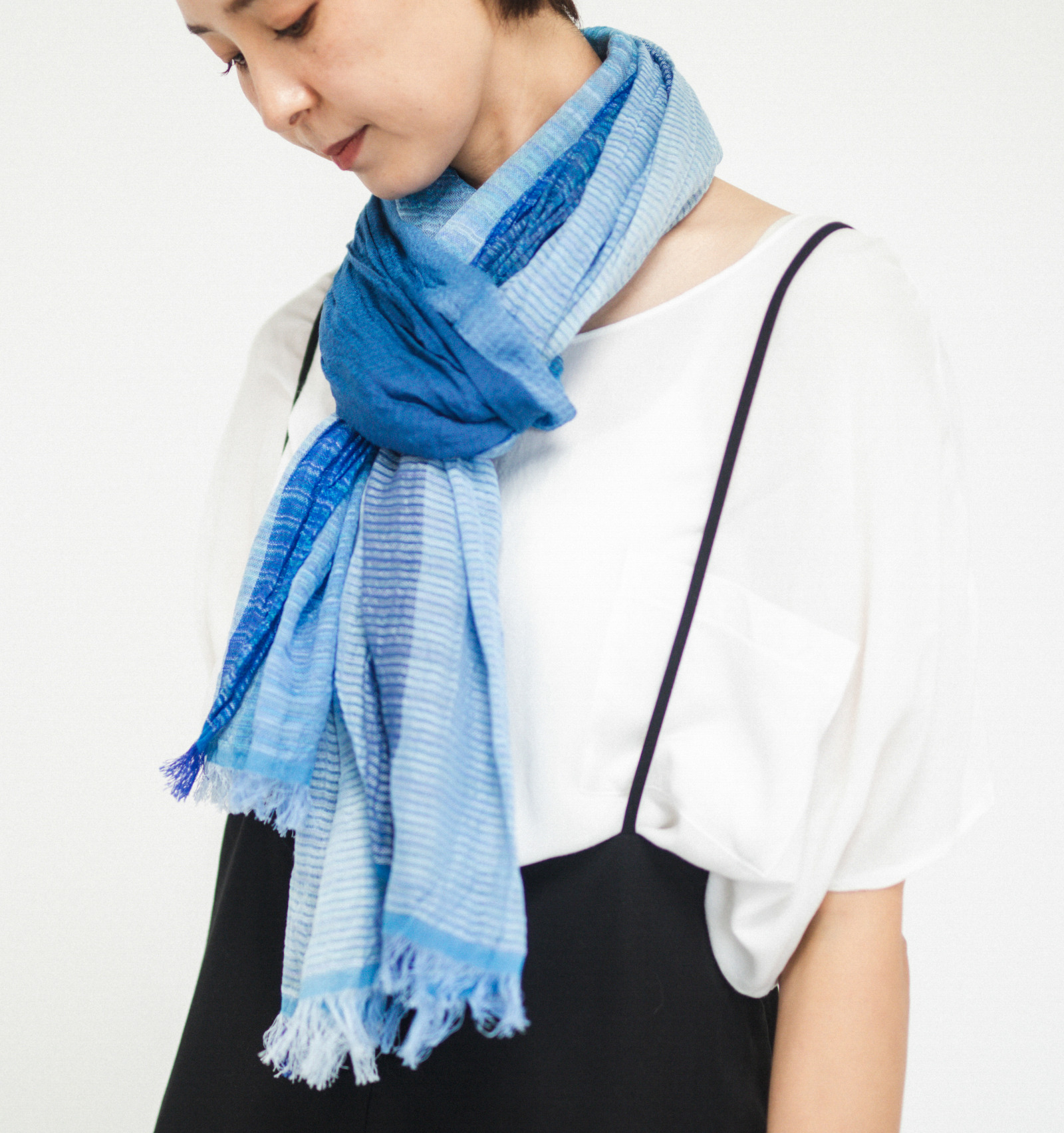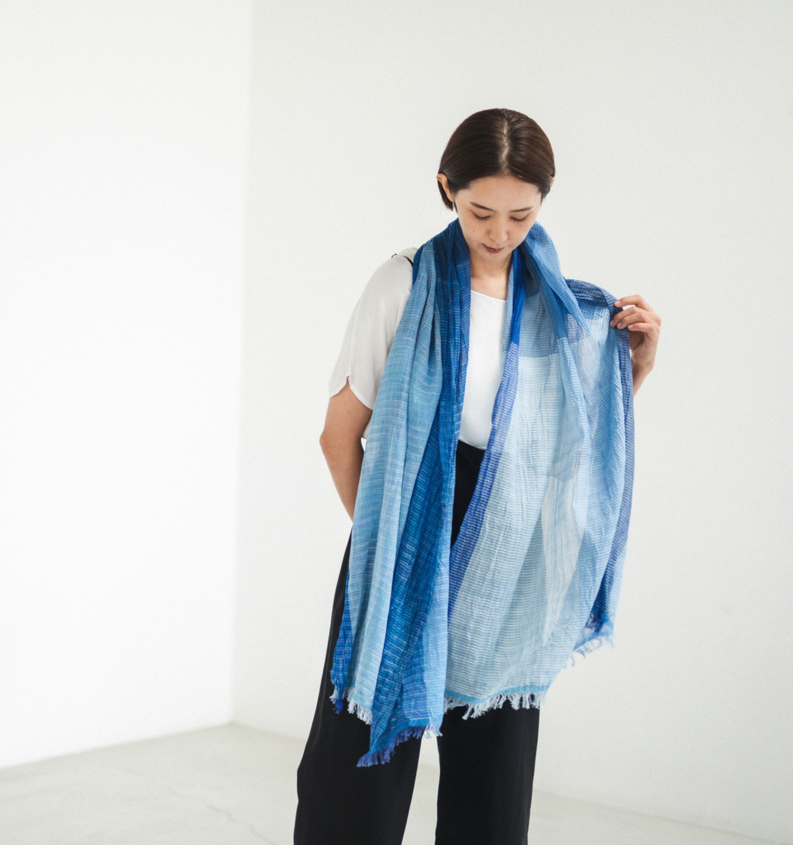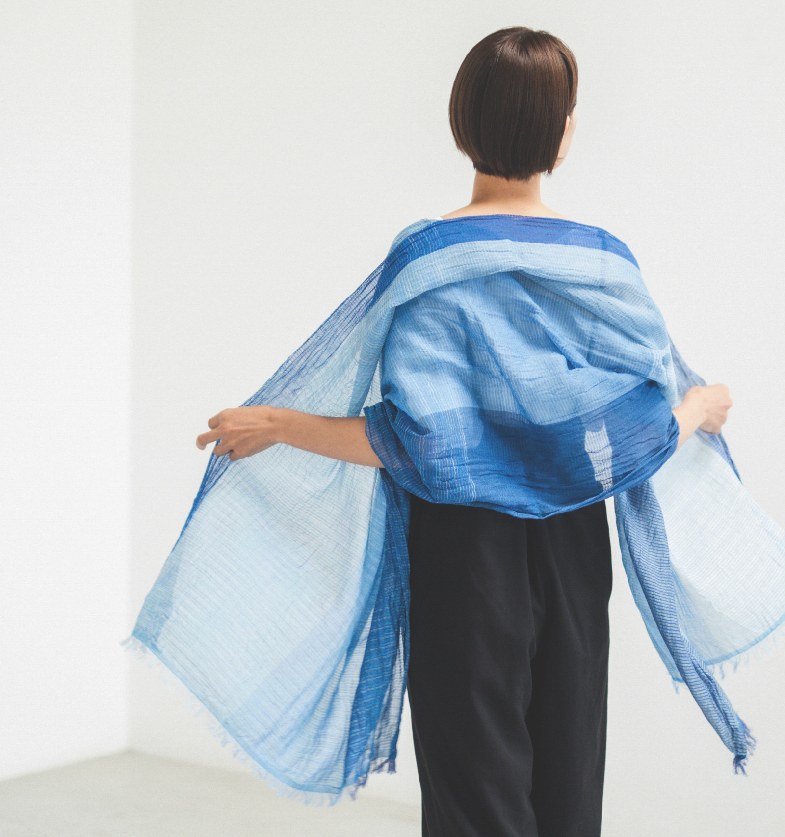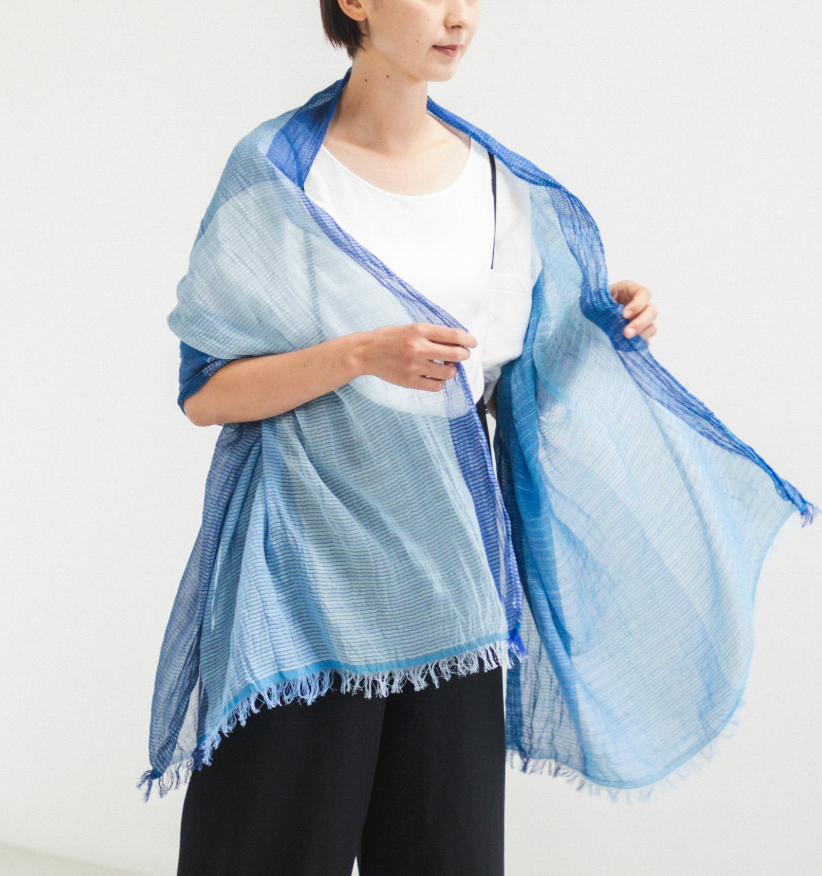 伸縮性のある大判生地は、くしゅっと無造作に巻くだけで自然なボリュームが生まれます。重ねた布のあいだに空気の層ができ、その空気が体温でほんのりとあたたまり、やわらかく包み込むような感覚に。見た目は涼やかでも、春先のまだ肌寒さが残る頃に心強い存在です。