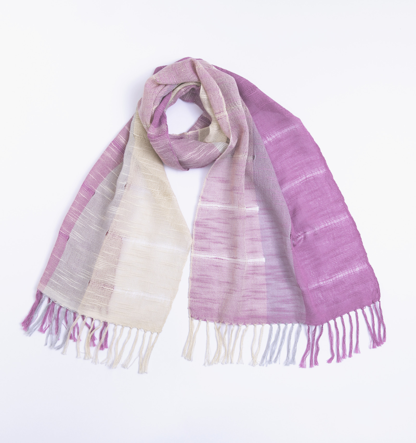 淡いきなりをベースに、澄んだ色がゆるやかに重なり合う三色の構成。はっきりと区切らないグラデーションが、布の中で自然に溶け合い、やわらかな奥行きを描きます。巻き方や重なり方によって見える色の分量が変わり、そのたびに異なる表情が現れます。