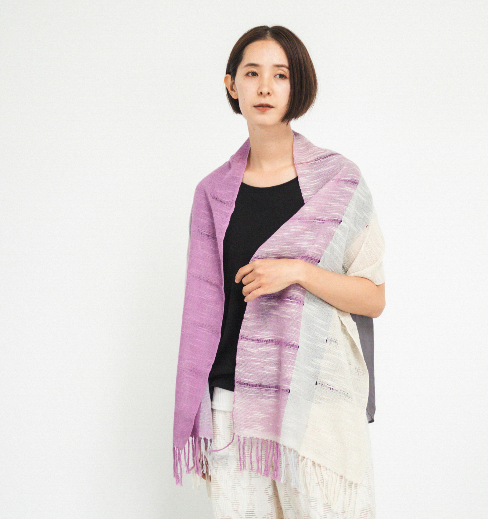 このストールでは、一般的な空羽織りとは異なり、横方向に段違いで透かしが現れる構造に。小さな織機を操る工房織座ならではの工夫が織り込まれています。