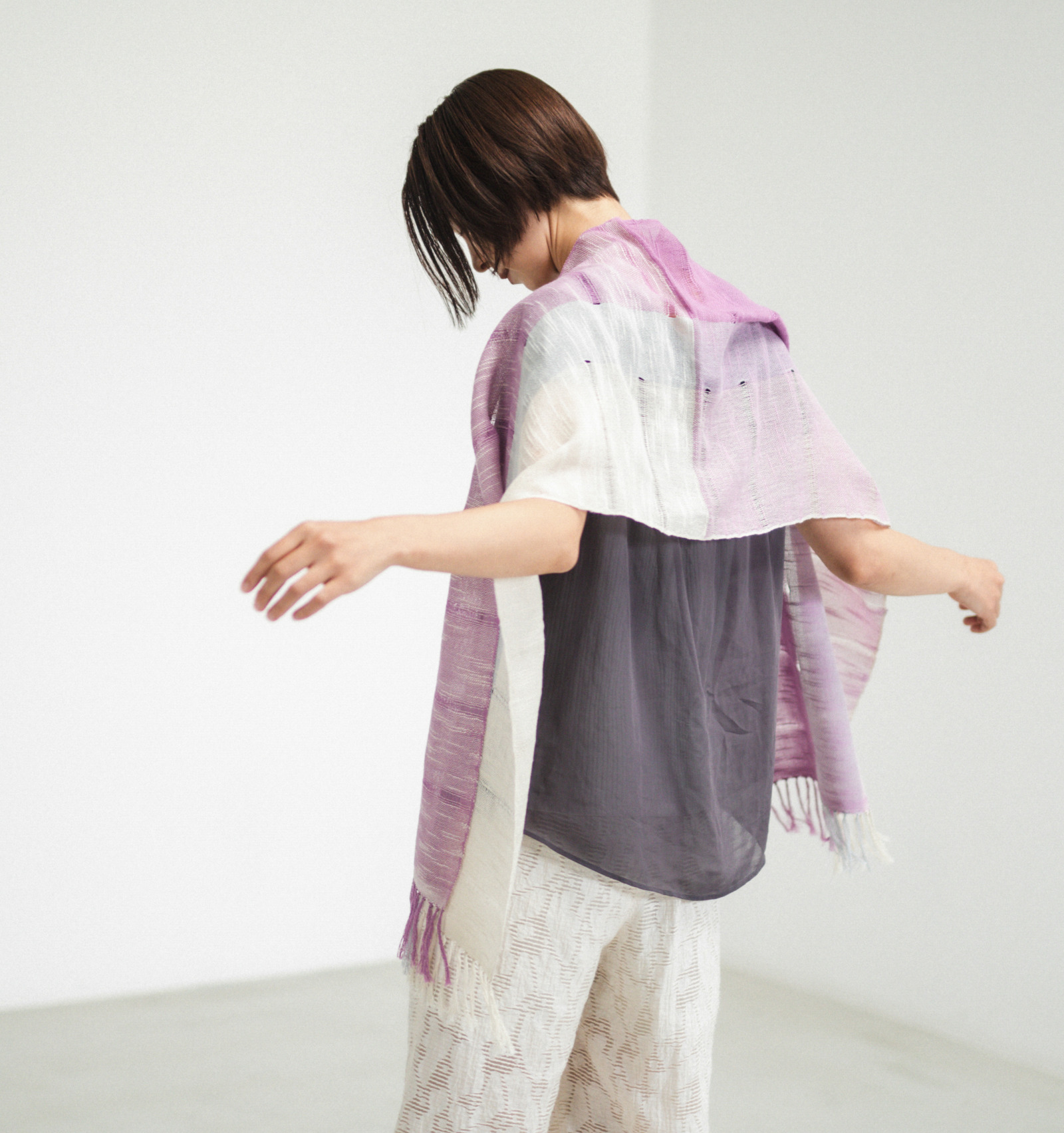 光を受けるとやわらかく透け、重ねるとさりげなく影をつくる。その構造そのものが、まといに軽やかな立体感を添えています。