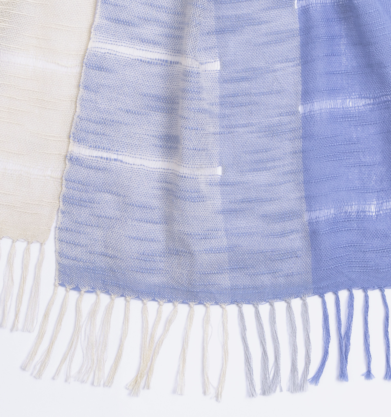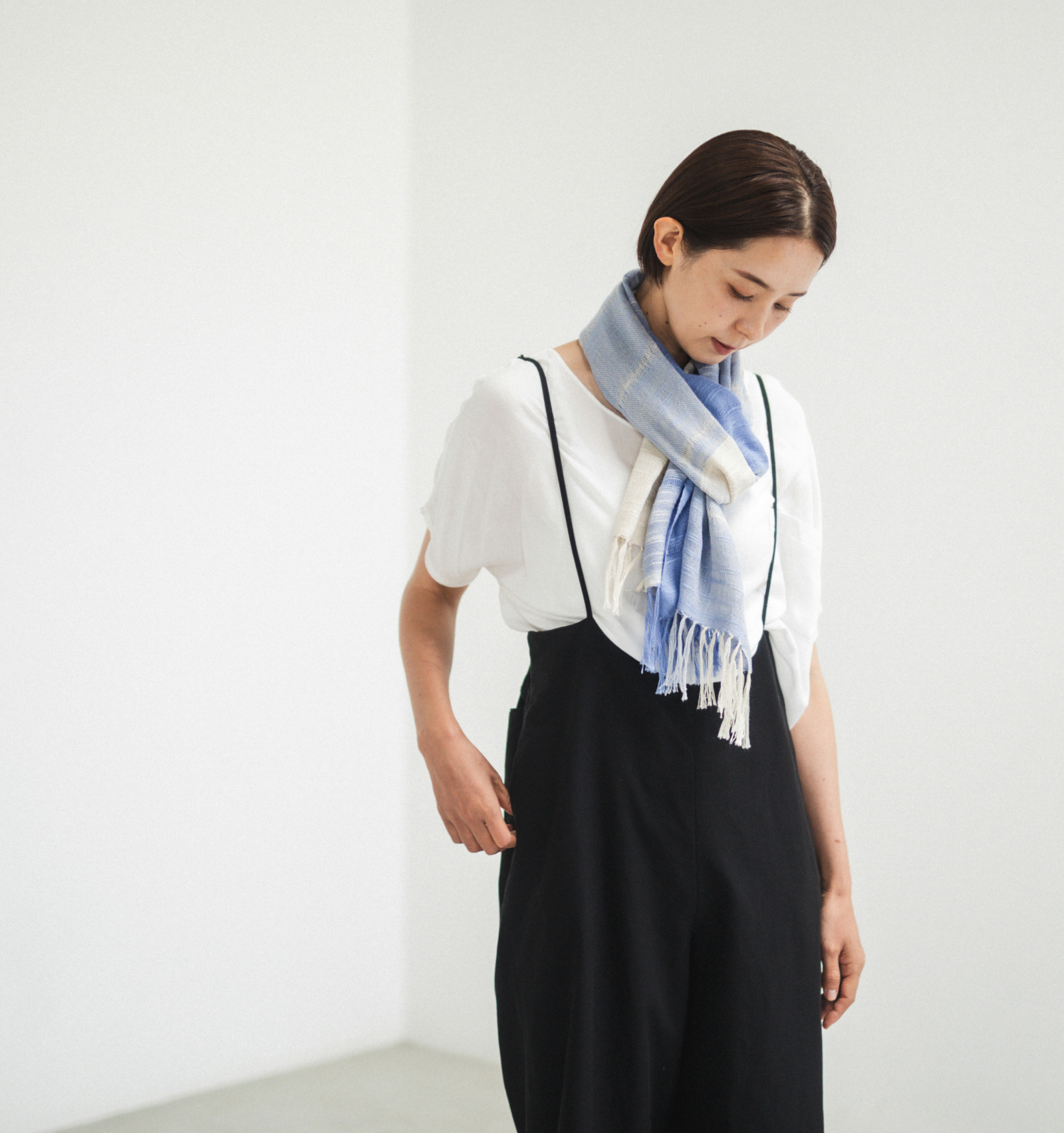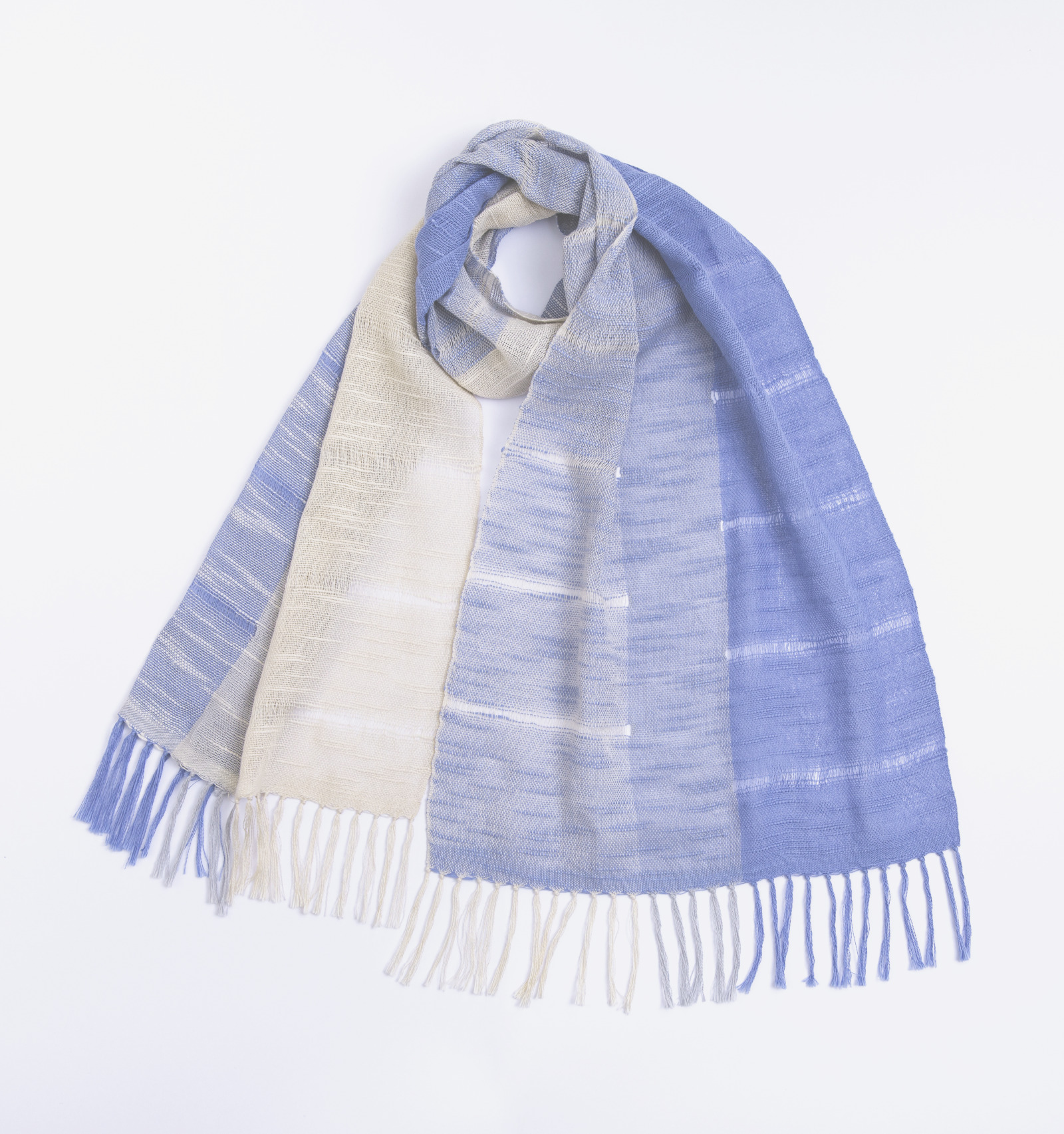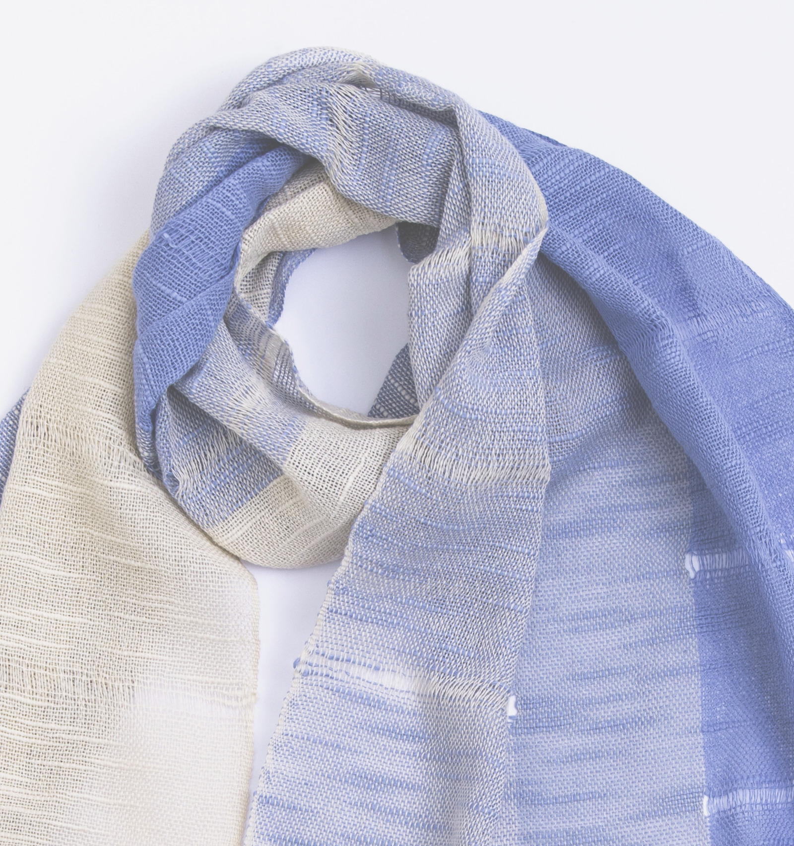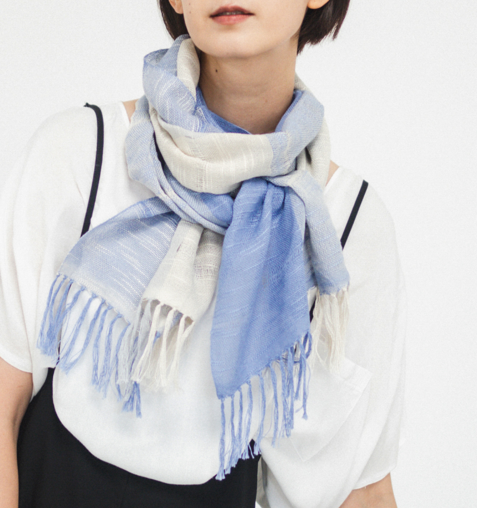 淡いきなりをベースに、澄んだ色がゆるやかに重なり合う三色の構成。はっきりと区切らないグラデーションが、布の中で自然に溶け合い、やわらかな奥行きを描きます。巻き方や重なり方によって見える色の分量が変わり、そのたびに異なる表情が現れます。