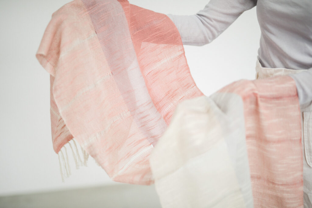 革新的な高速織機では表現しにくい、細やかな調整の積み重ね。透かしが均一に並ばないことで、巻いたときに自然な動きが生まれ、奥行きのある表情へとつながります。