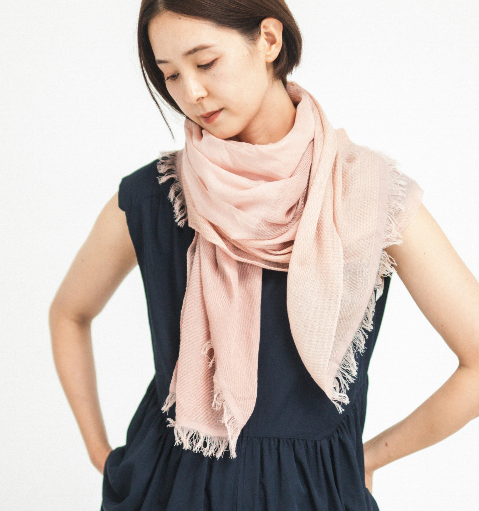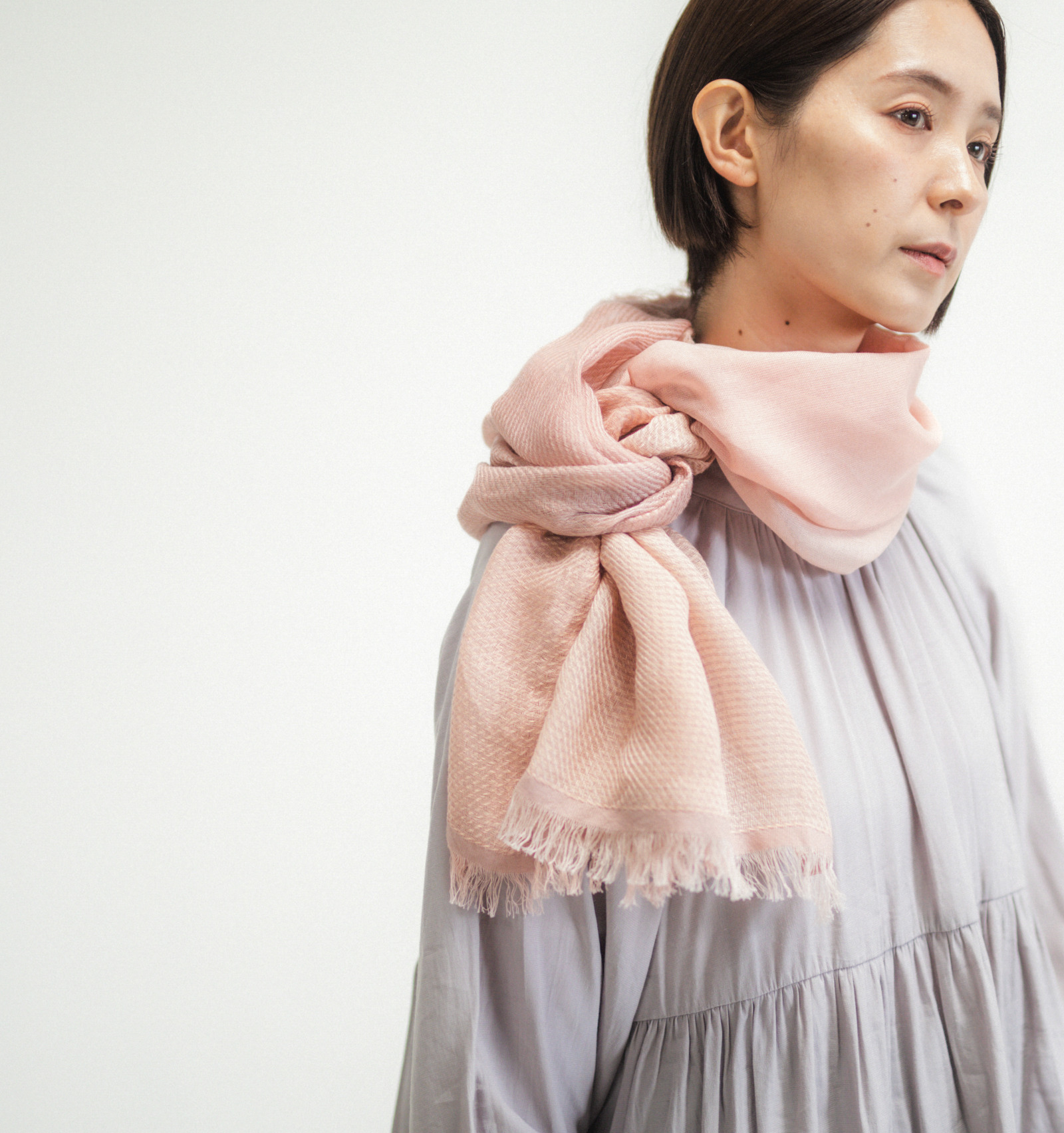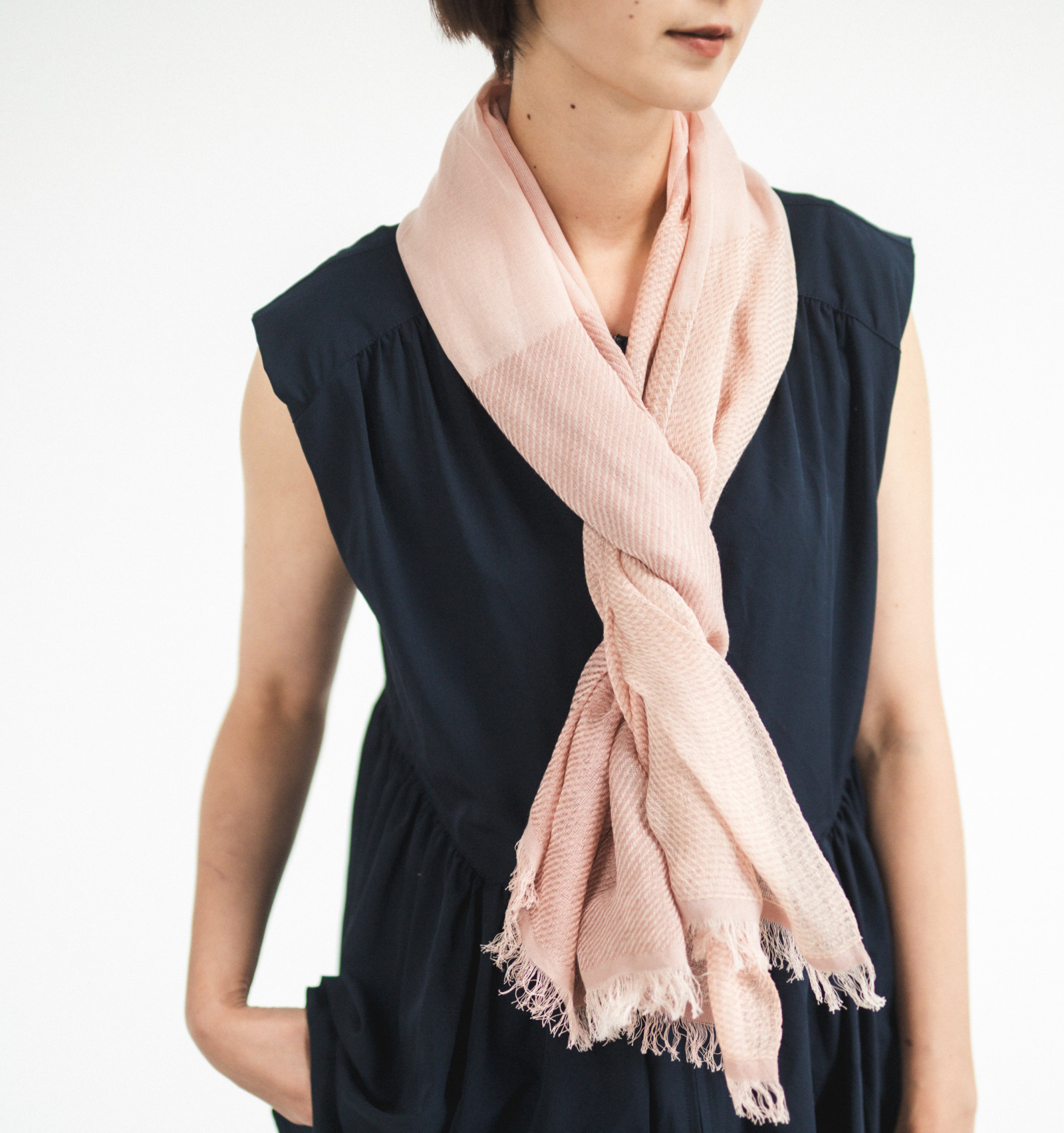 ねじって巻くと、その色の変化が重なり合い、首元にやさしい陰影が生まれます。