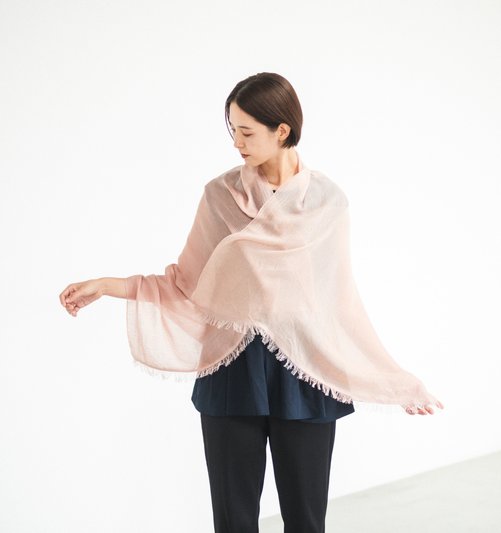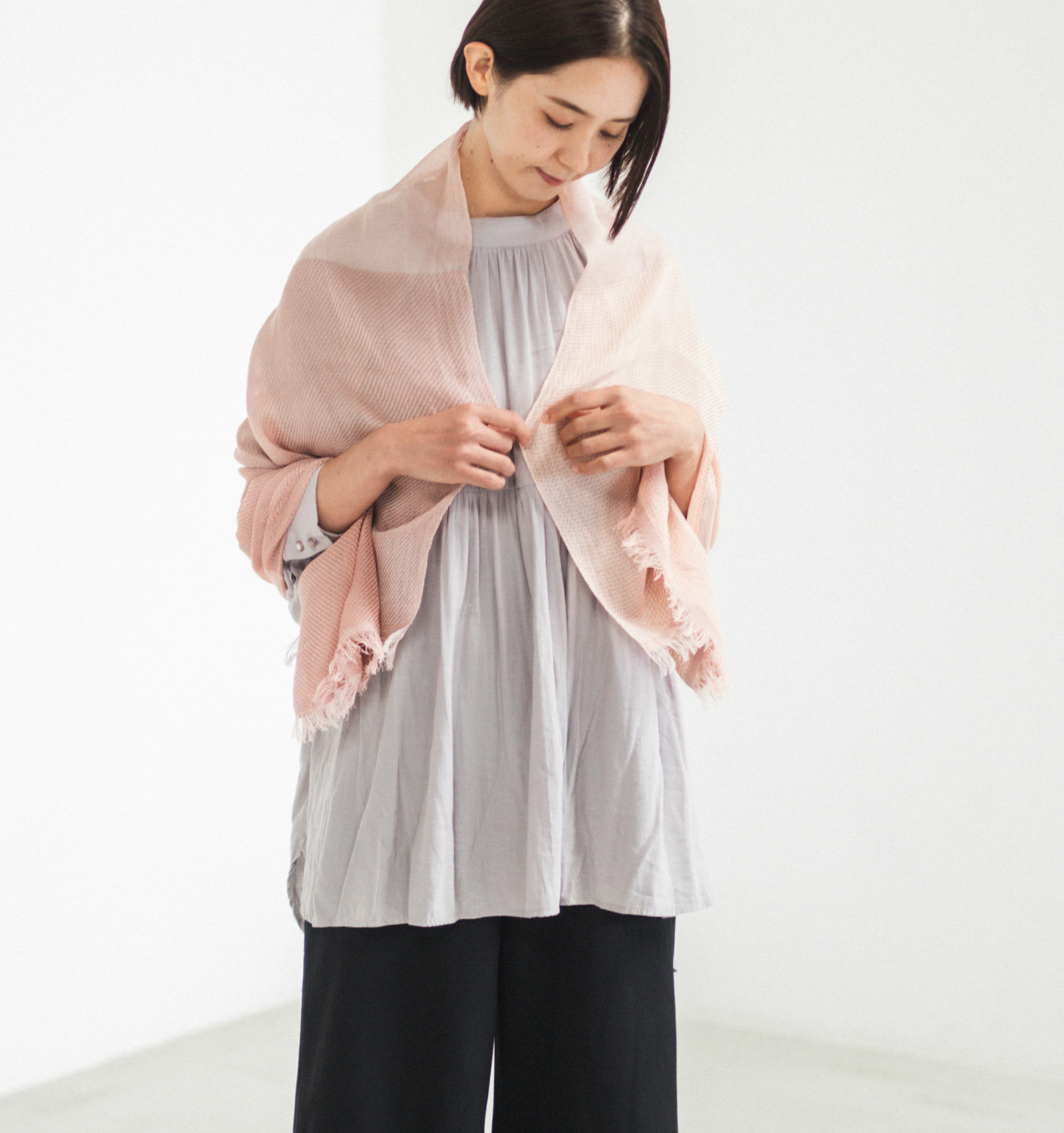 ショールを肩に羽織り、両端の生地をそっと重ねてみてください。