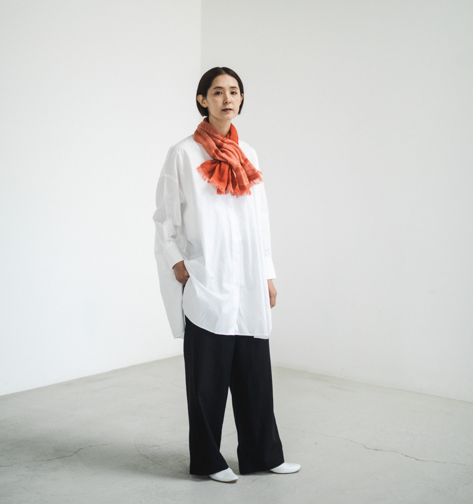 くるりと首にかけて、片側のトンネルにもう一方を通すだけ。 それだけで、すっと形が整い、落ち着いた表情が生まれるショートマフラーです。