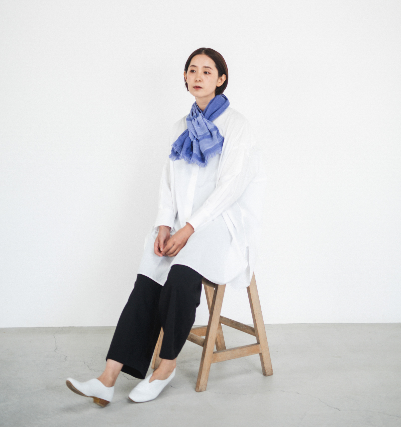 素材にはコットン100%を使用。空気を含むようなやわらかさと、さらりとした肌ざわりが首元に心地よくなじみます。