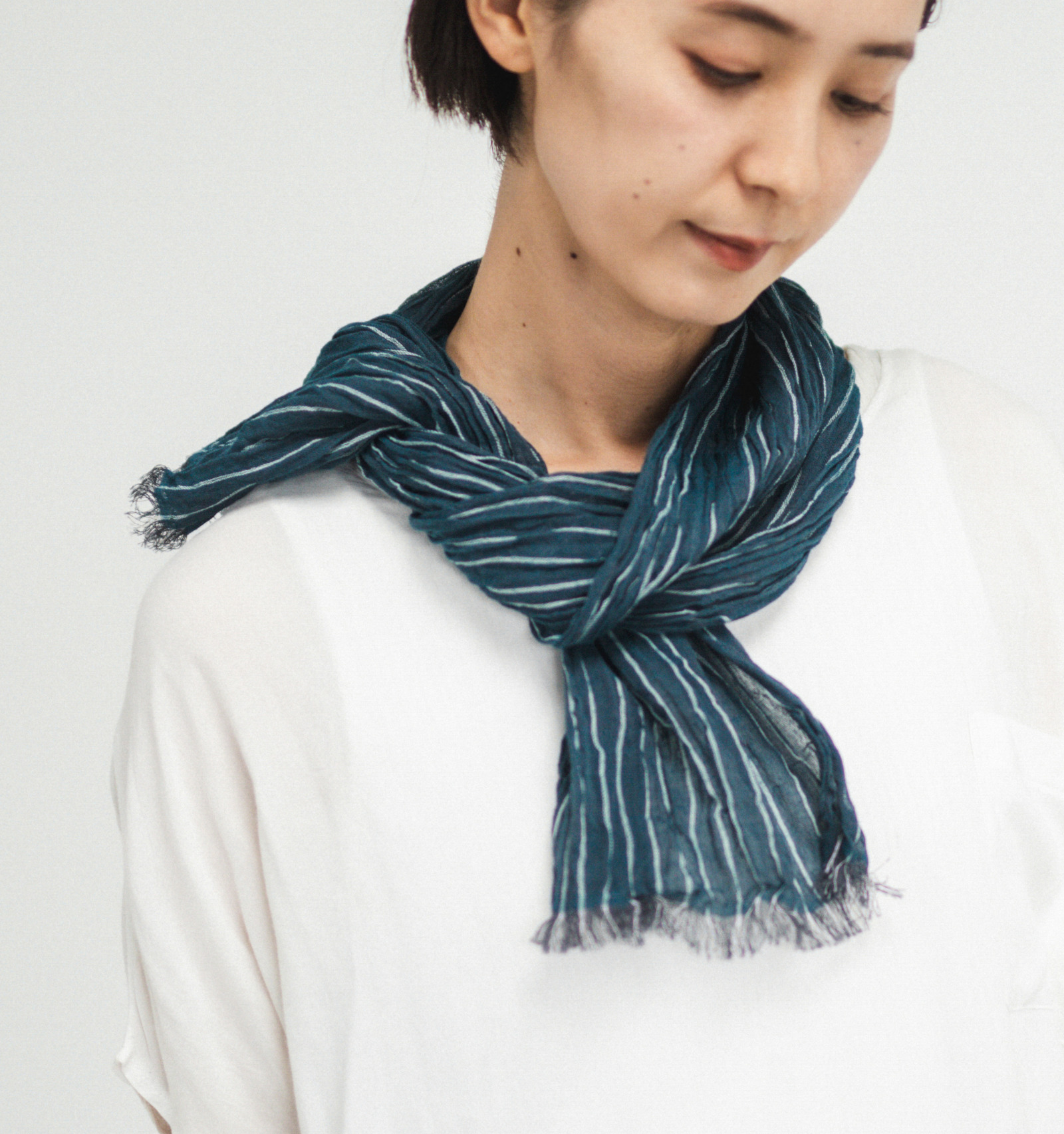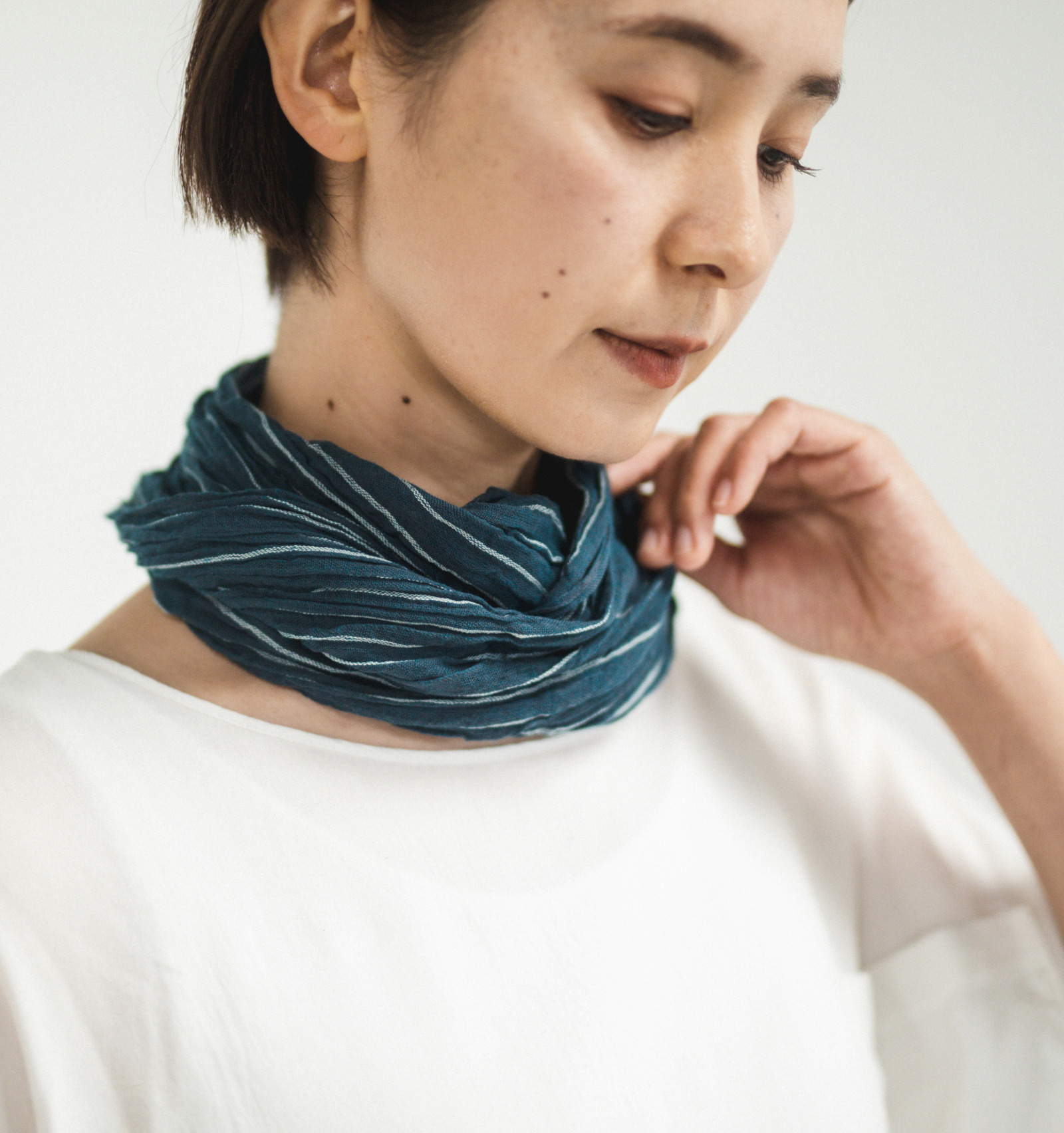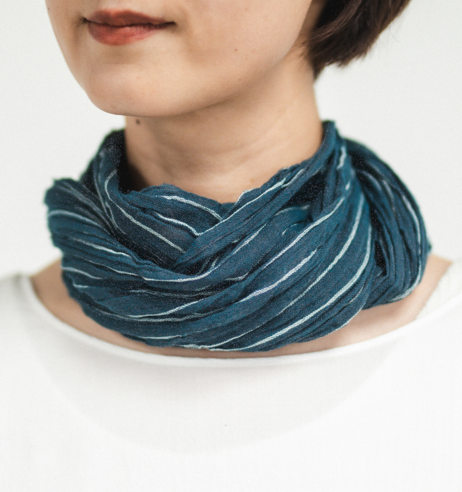 一般的な手ぬぐいと異なるのは、よこ糸に伸縮性のある糸を用いている点です。生地全体にやわらかなシワ感が生まれることで、首元に巻いたときもすっきりと収まりやすく、自然な美しさが引き出されています。