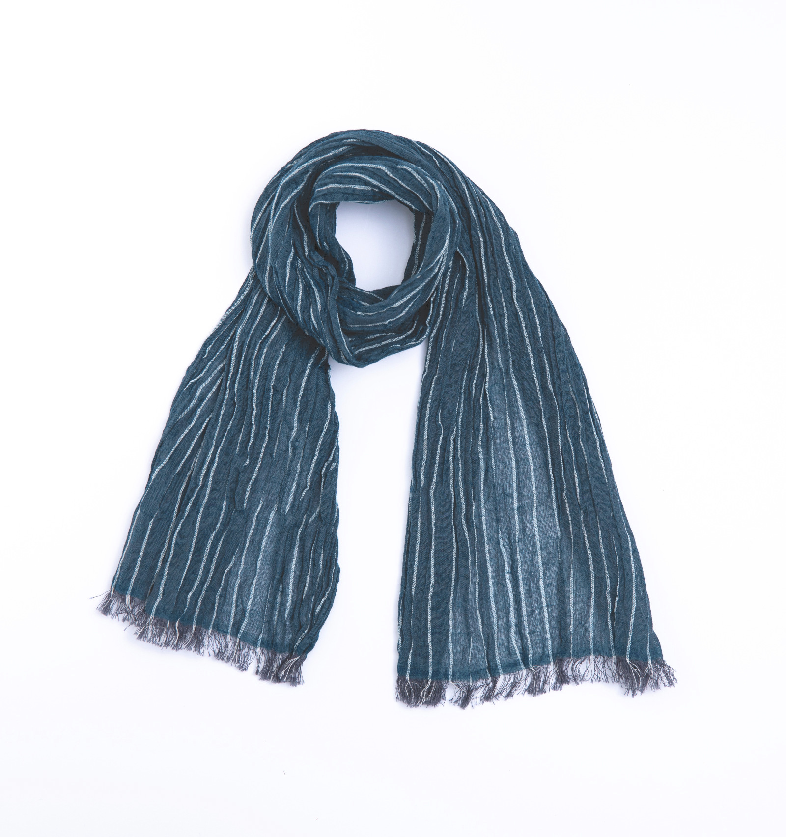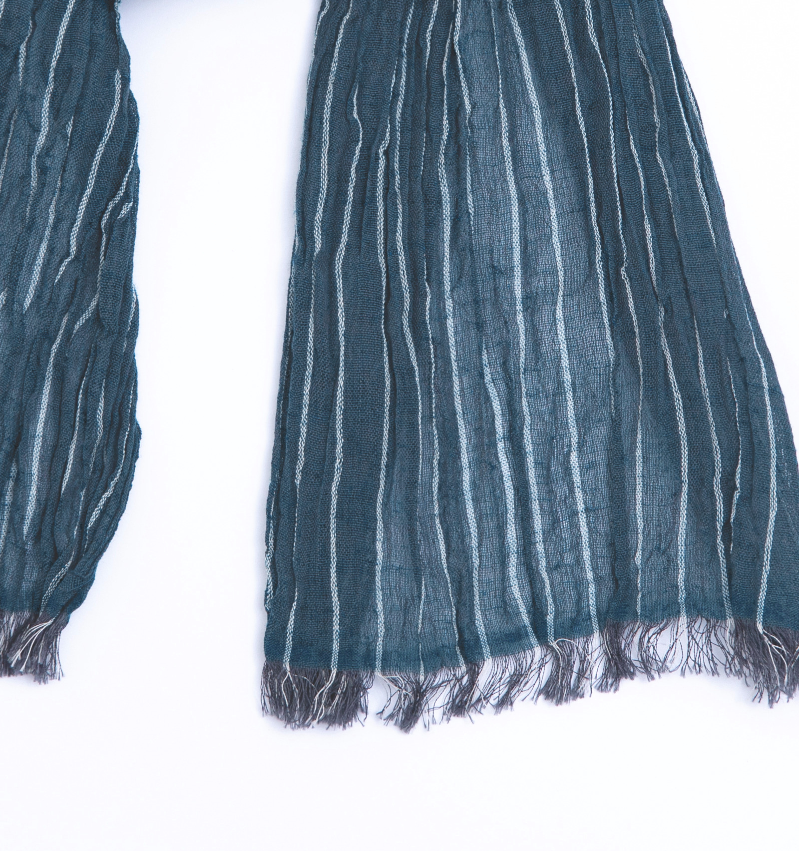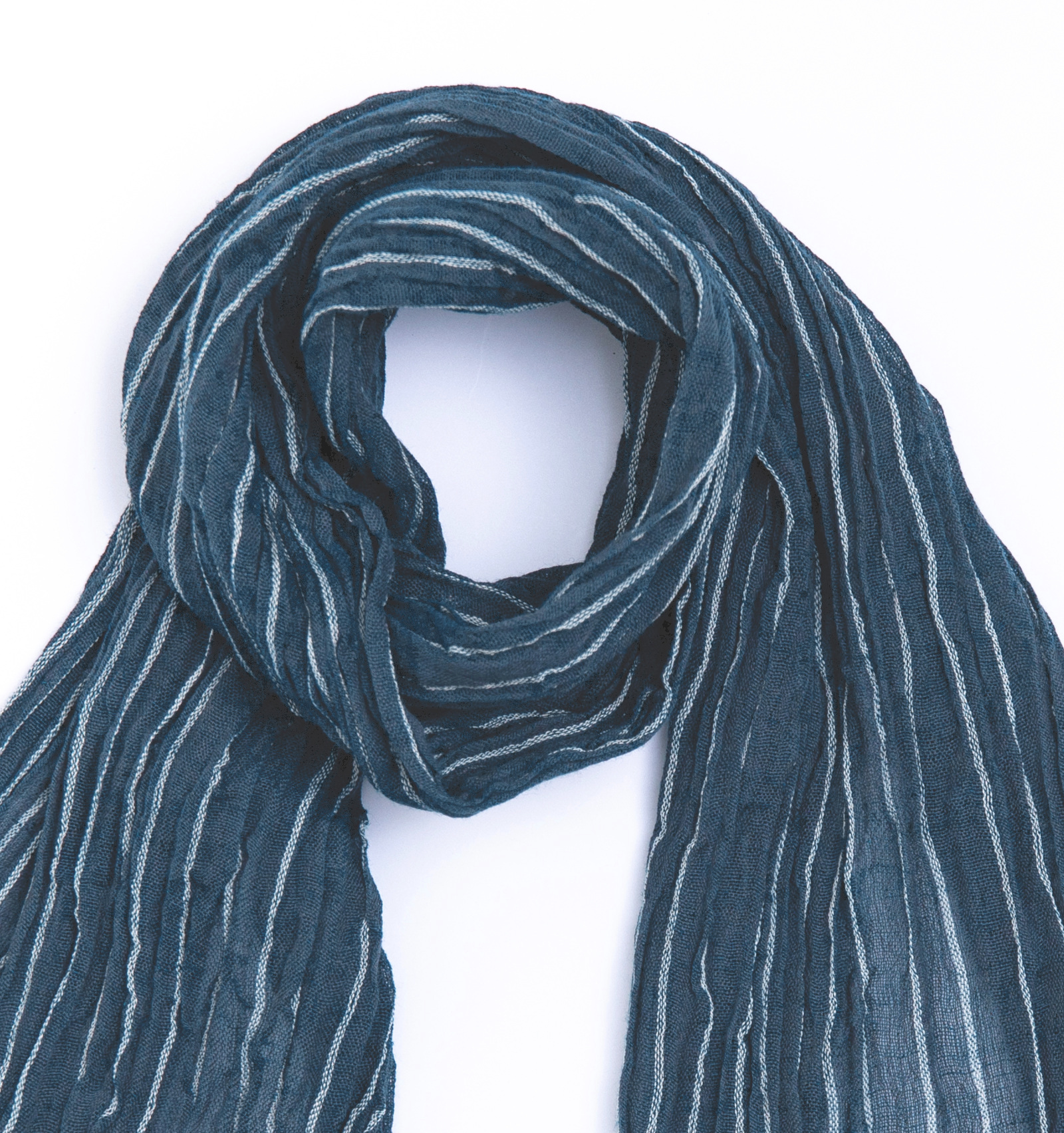 一般的な手ぬぐいと異なるのは、よこ糸に伸縮性のある糸を用いている点です。生地全体にやわらかなシワ感が生まれることで、首元に巻いたときもすっきりと収まりやすく、自然な美しさが引き出されています。