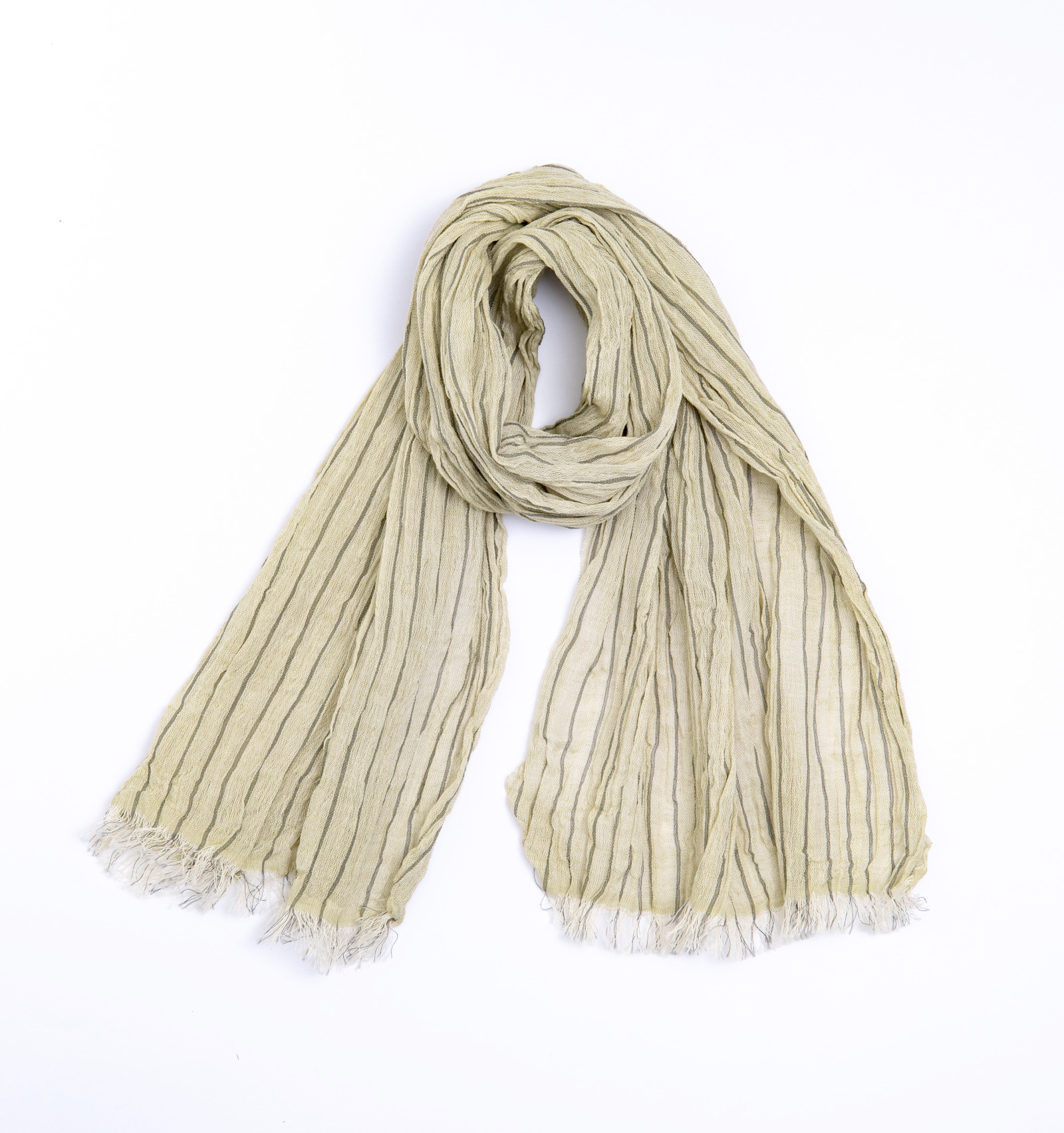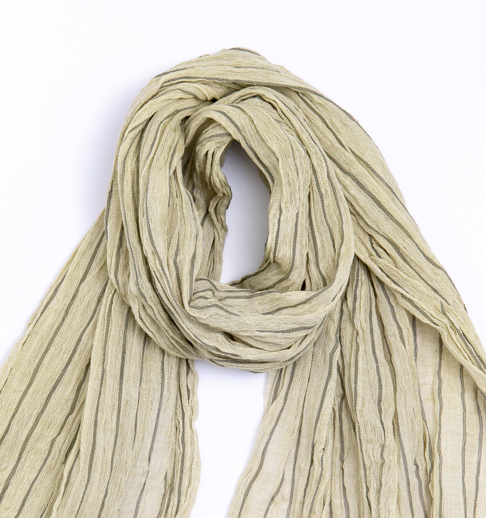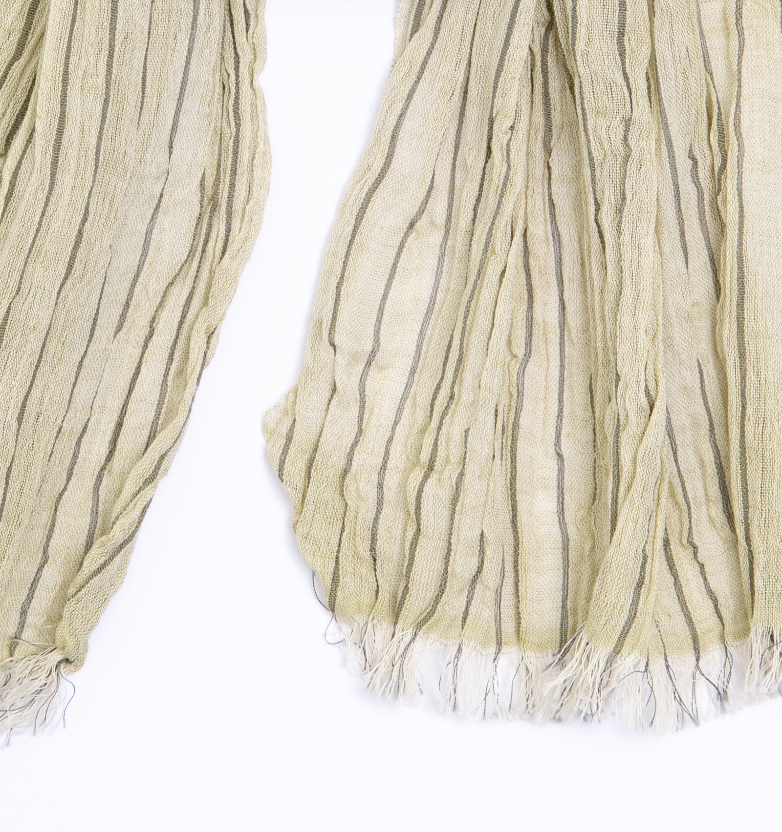 すっきりと巻けて、見た目にも涼やかで、暑苦しさを感じにくいものを。そんなイメージから、軽やかなバランスが大切にされています。表面にほどよく入ったシワが肌との間にわずかな空間を生み、風が通り抜けるような感覚に。綿に少しの麻を加えることで、さらりとしたシャリ感も感じられ、汗ばむ季節にも心地よく寄り添います。