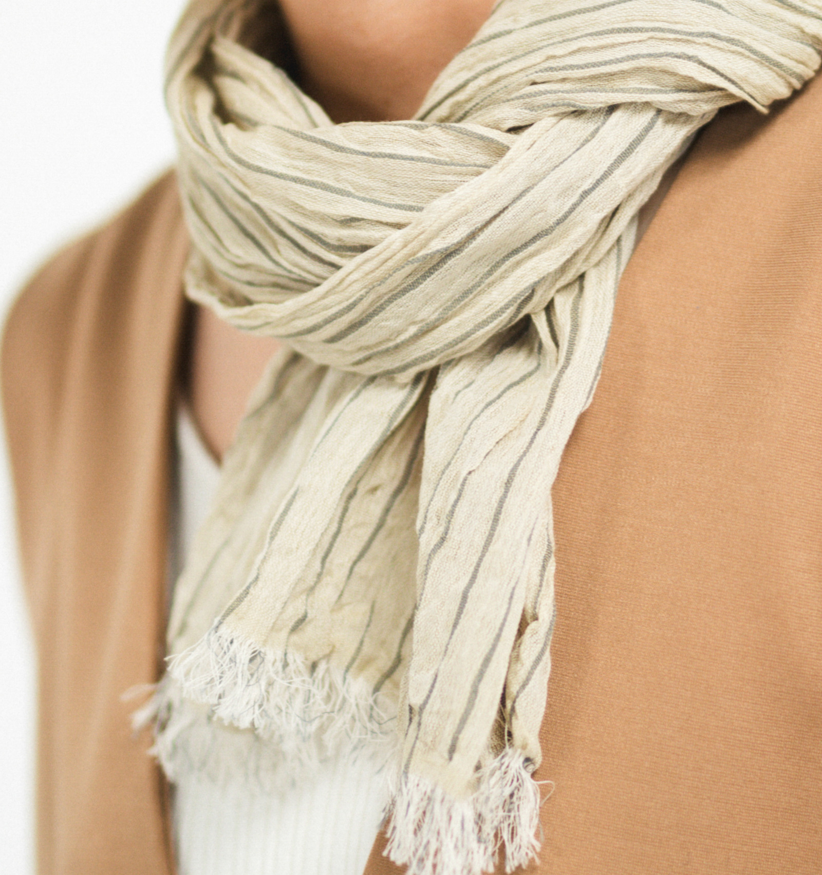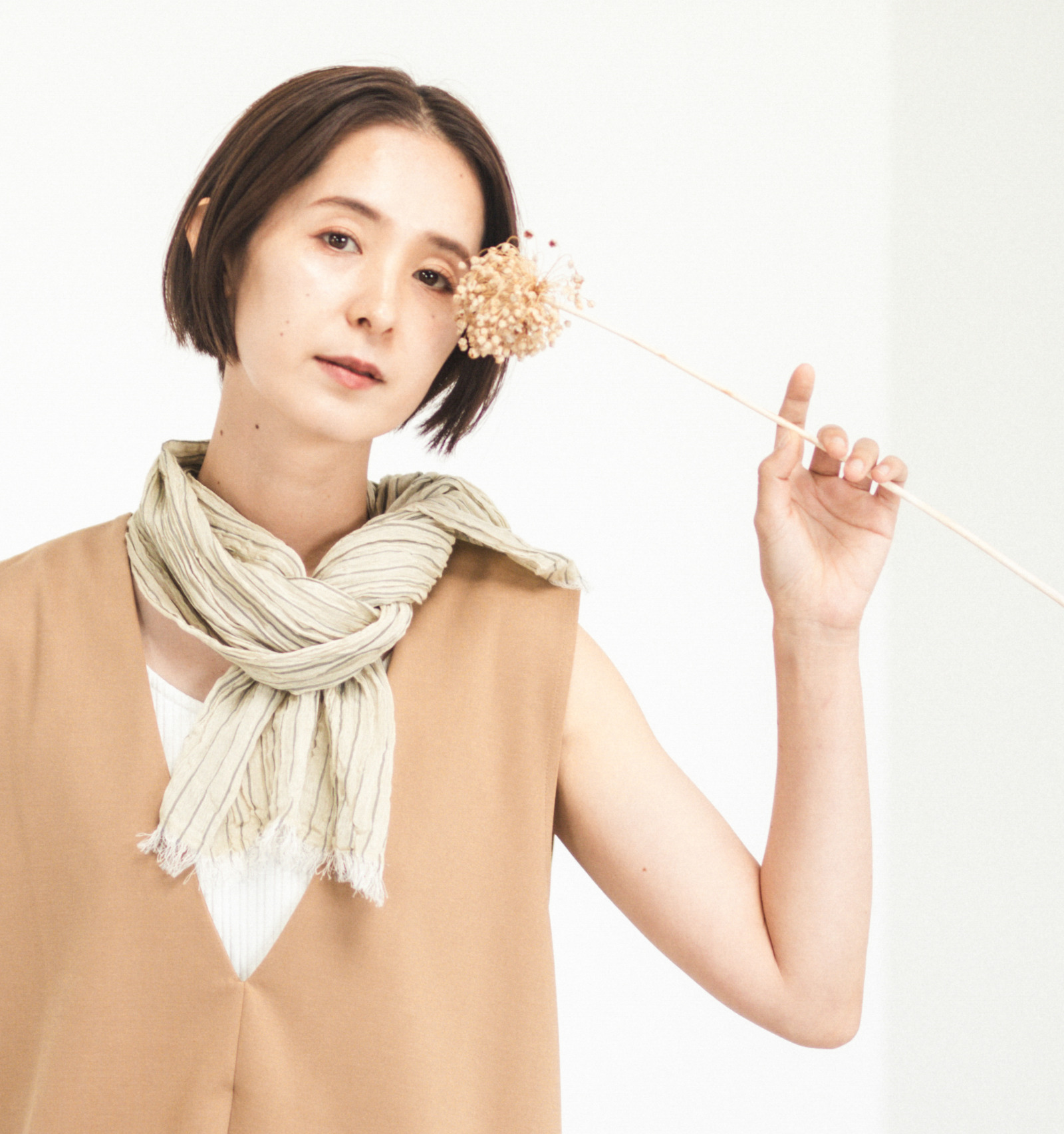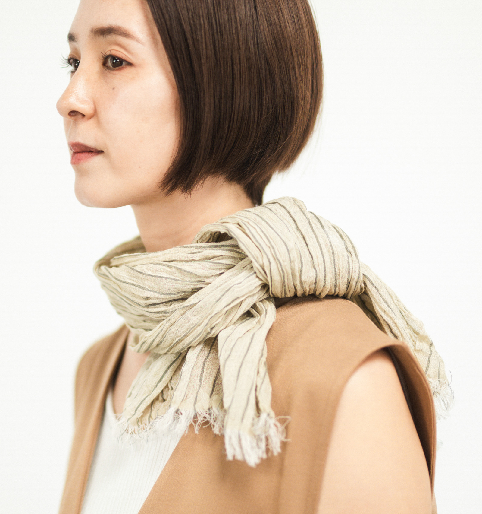 昨年の厳しい暑さの中、外出先で首元に巻物を添えている人の姿をよく見かけました。日差しを避けたい気持ちと、少しでも涼しく過ごしたいという思い。その様子が、このスカーフのきっかけのひとつになっています。