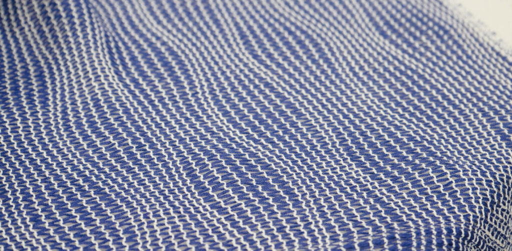この織りでは、経糸が波模様を描くように揺れながら布の中を走り、独特のゆらぎ模様が生まれます。