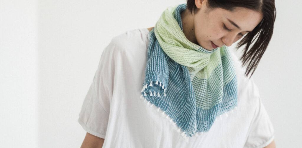 工房織座オリジナルの織り技法「たてよろけもじり織り」によって、軽く通気性に優れたショートマフラーに仕立てられています。